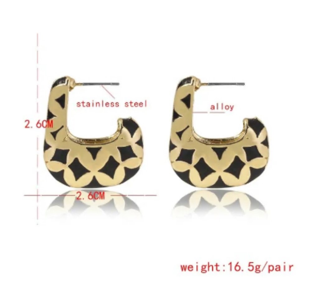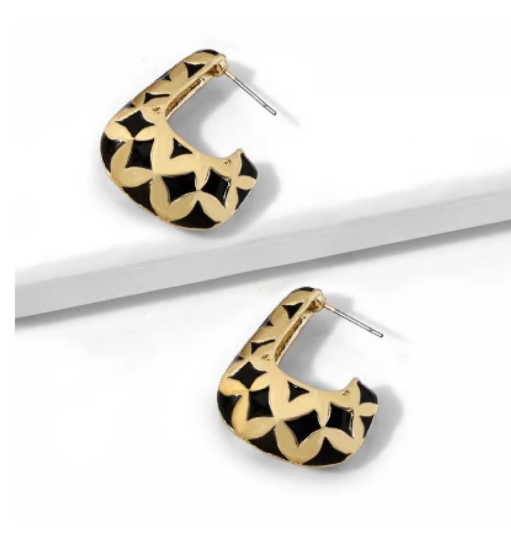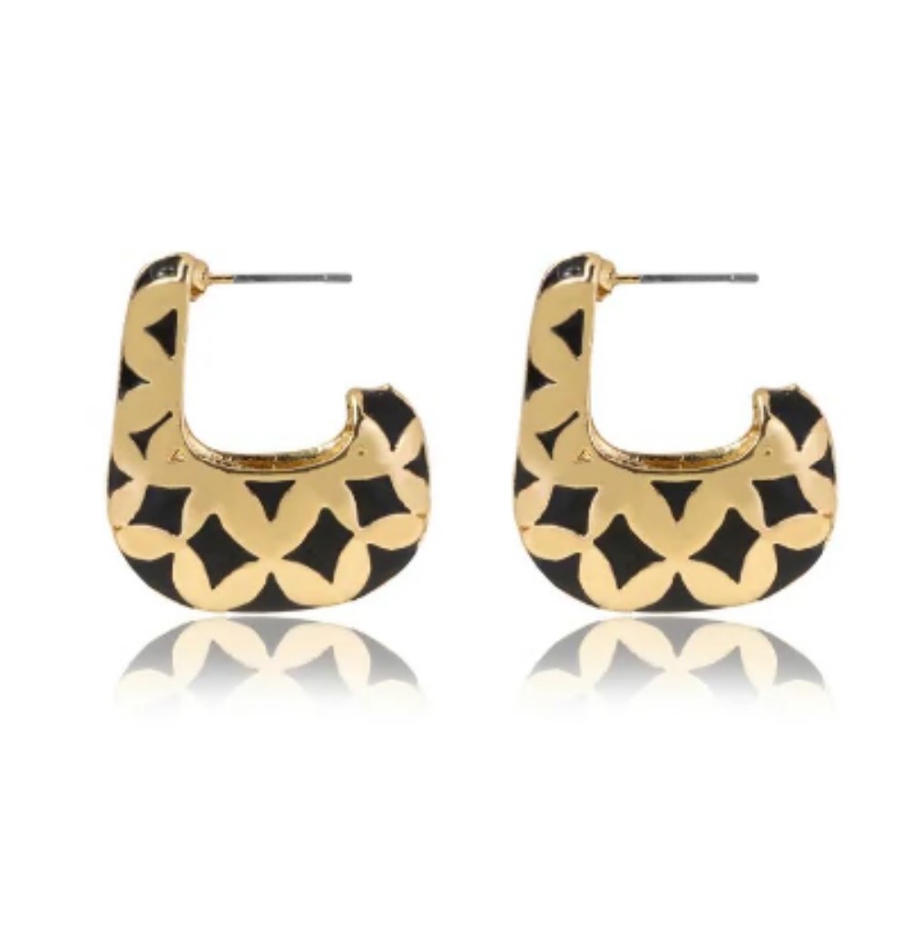 Sophisticated hoop earrings in black and gold, adorned with alternating geometric triangles for a striking yet elegant design.