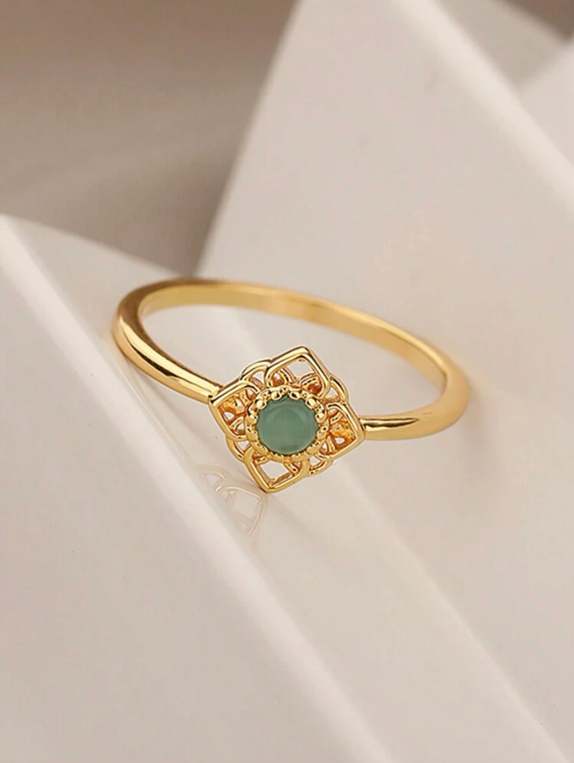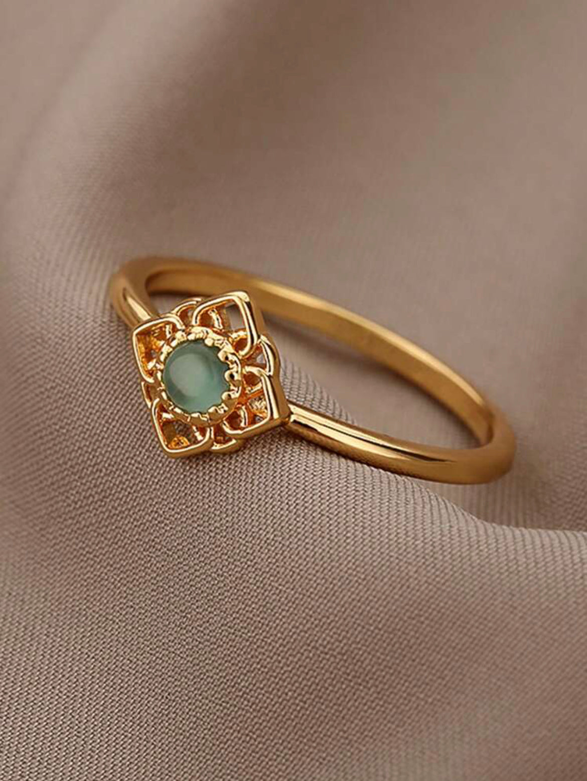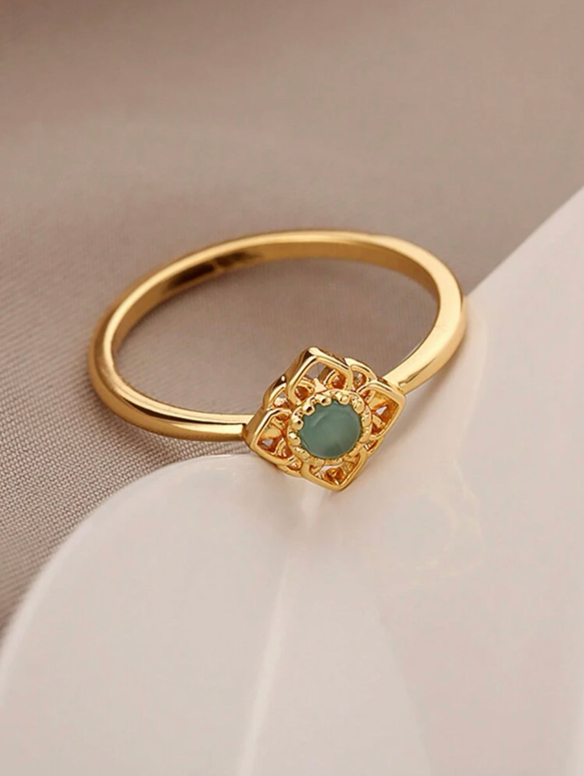 A gold ring with a vivid green gemstone and intricate detailing-elegant and refined.