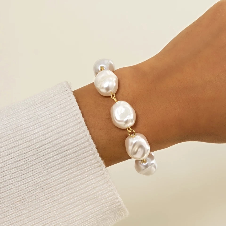 A graceful pearl bracelet featuring irregularly shaped white pearls linked by delicate gold accents, exuding timeless elegance and subtle sophistication.