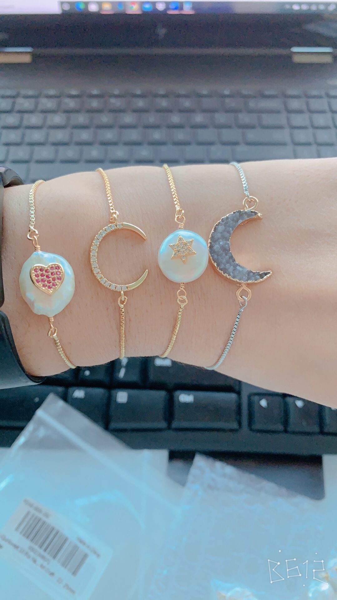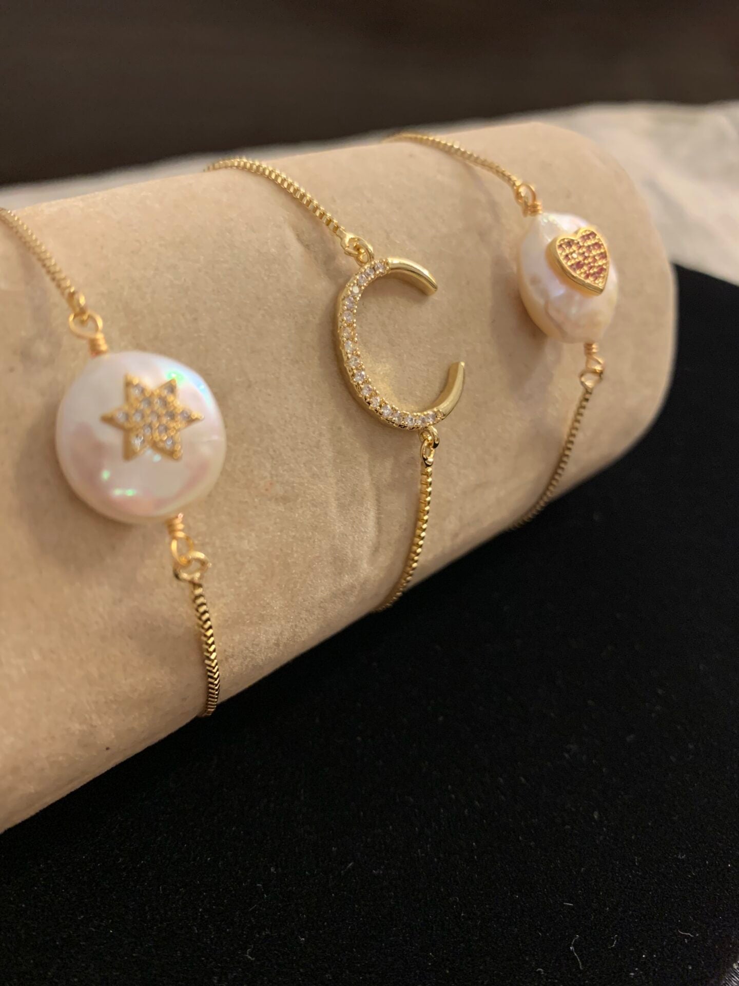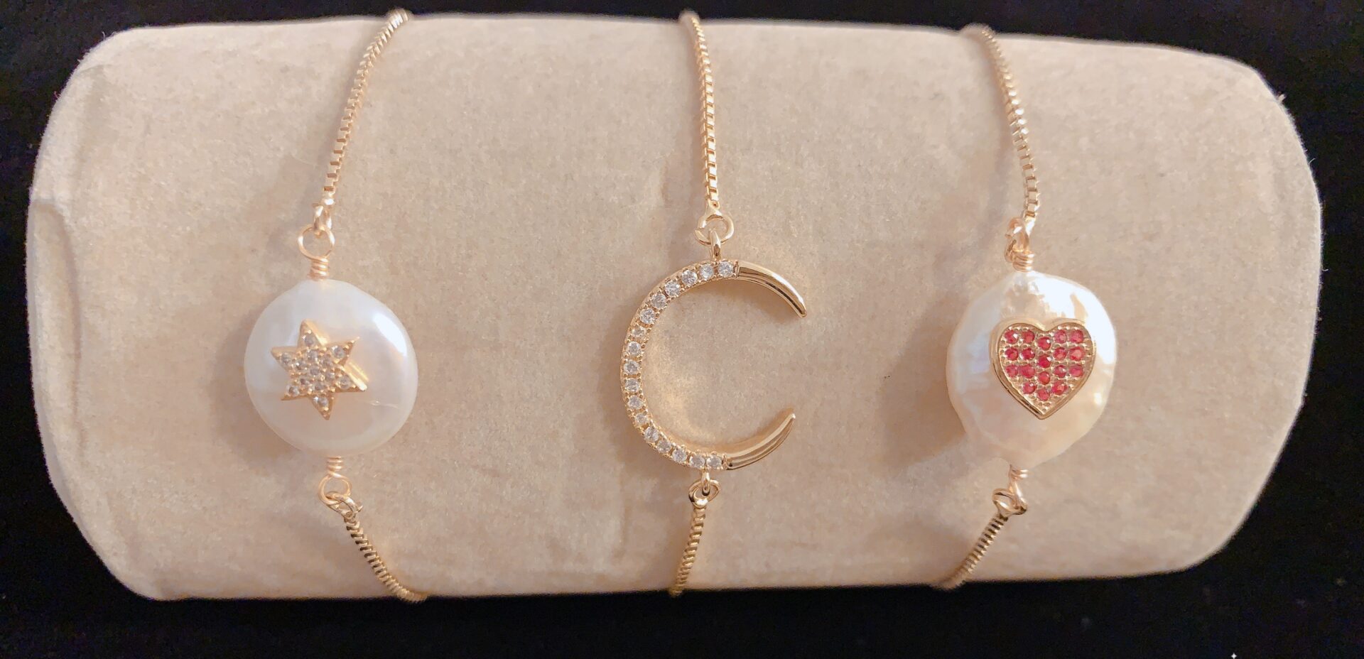 A trio of gold chain bracelets, each featuring a unique charm-star, moon, and heart-effortlessly blending simplicity and grace.