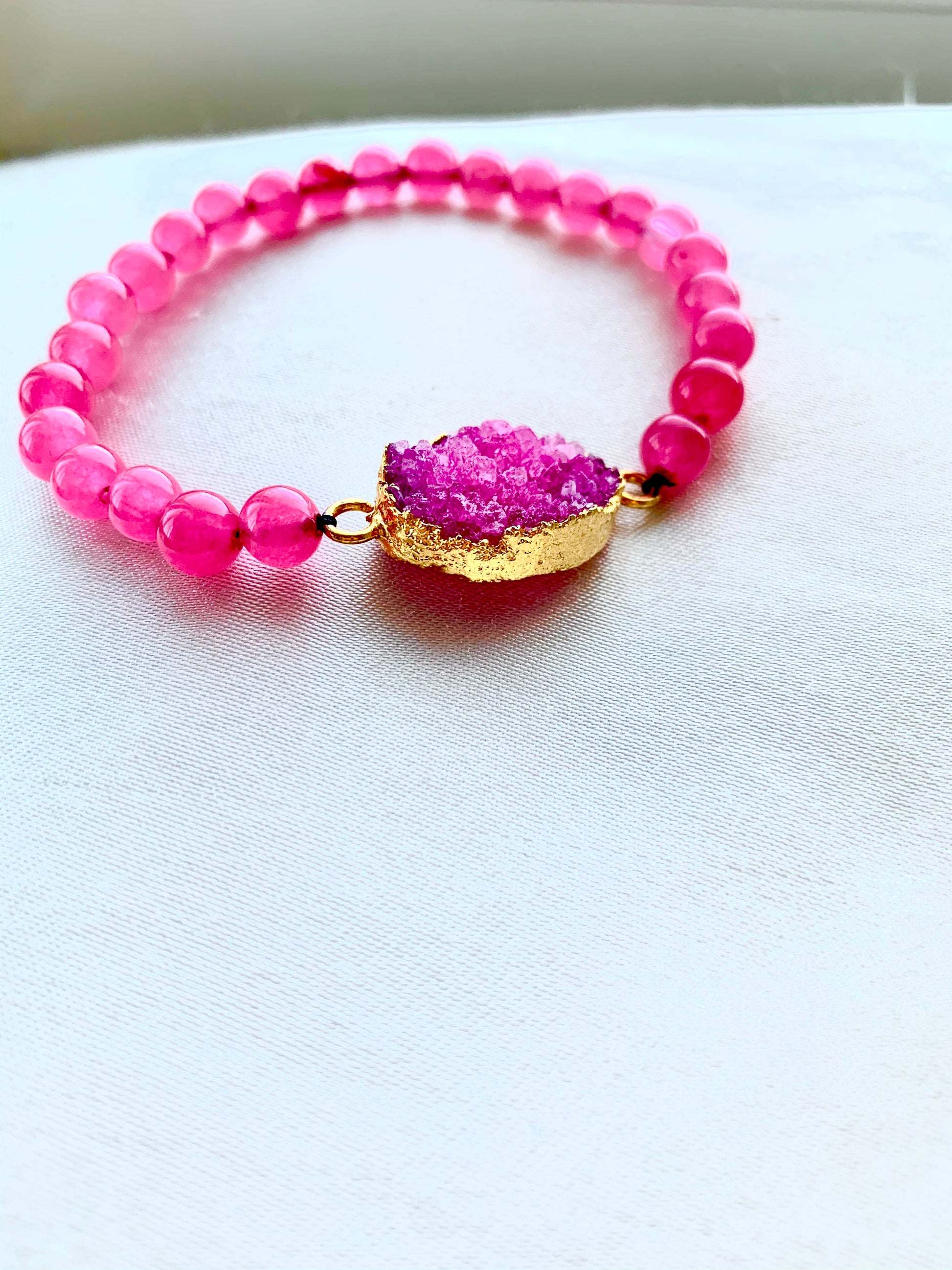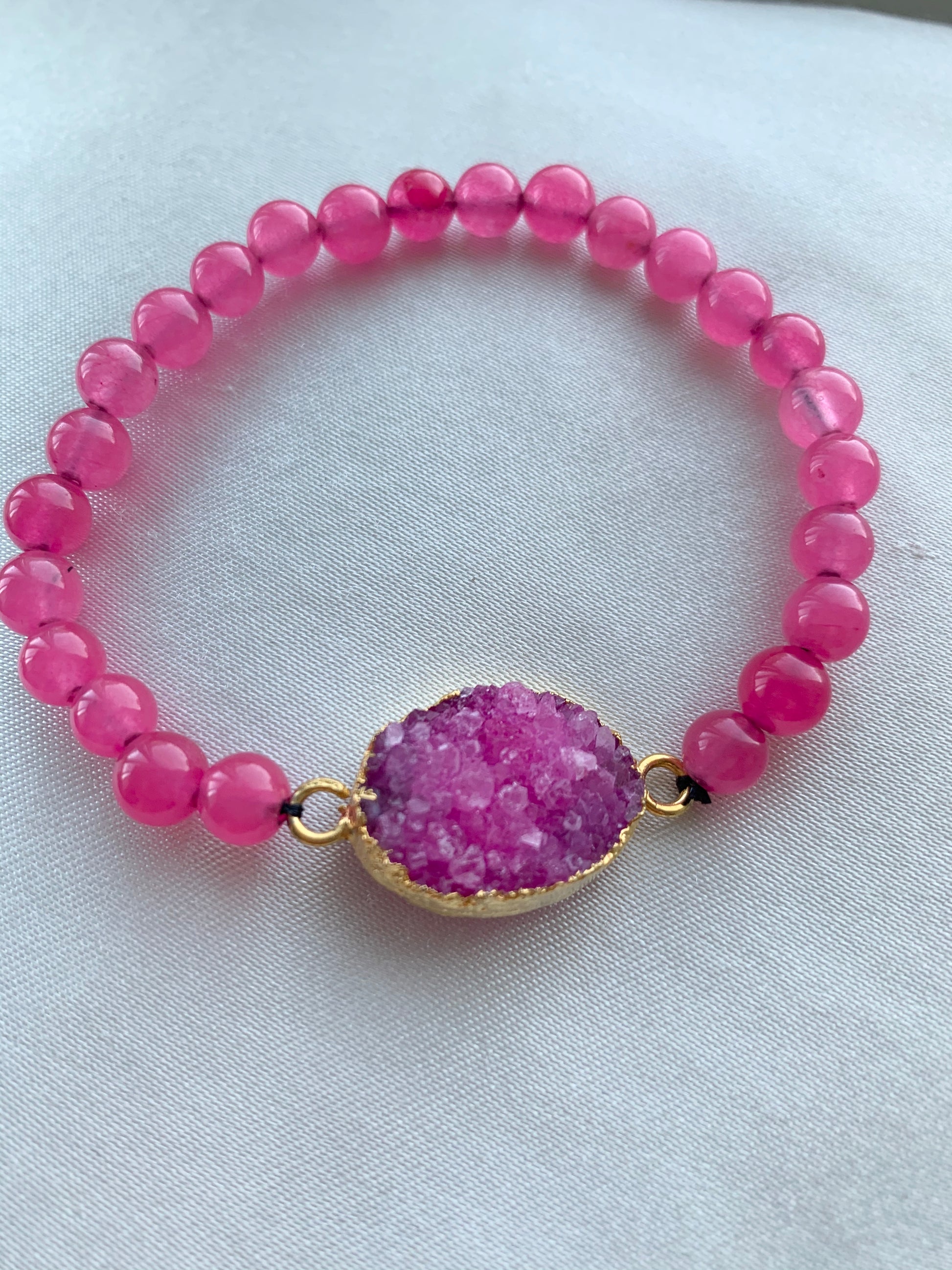 A chic elastic bracelet featuring glossy pink beads and a shimmering druzy quartz centerpiece, exuding playful elegance.