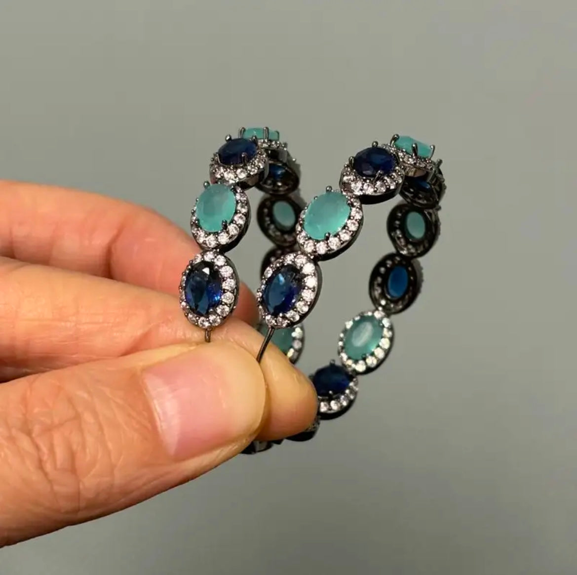 Turn heads with these stunning hoop earrings featuring alternating teal and deep sapphire blue oval stones set in a dark, antique-style metal. Perfect for elevating your everyday style or making a statement at a special event, these earrings are lightweight and designed to shine.