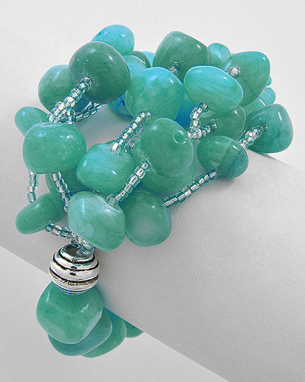 Dive into coastal charm with this handcrafted bracelet featuring smooth aqua stones strung on delicate beaded threads, finished with a bold silver accent. A refreshing pop of color for everyday elegance.
