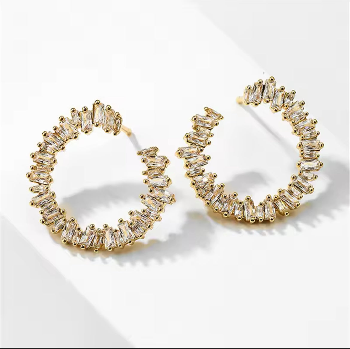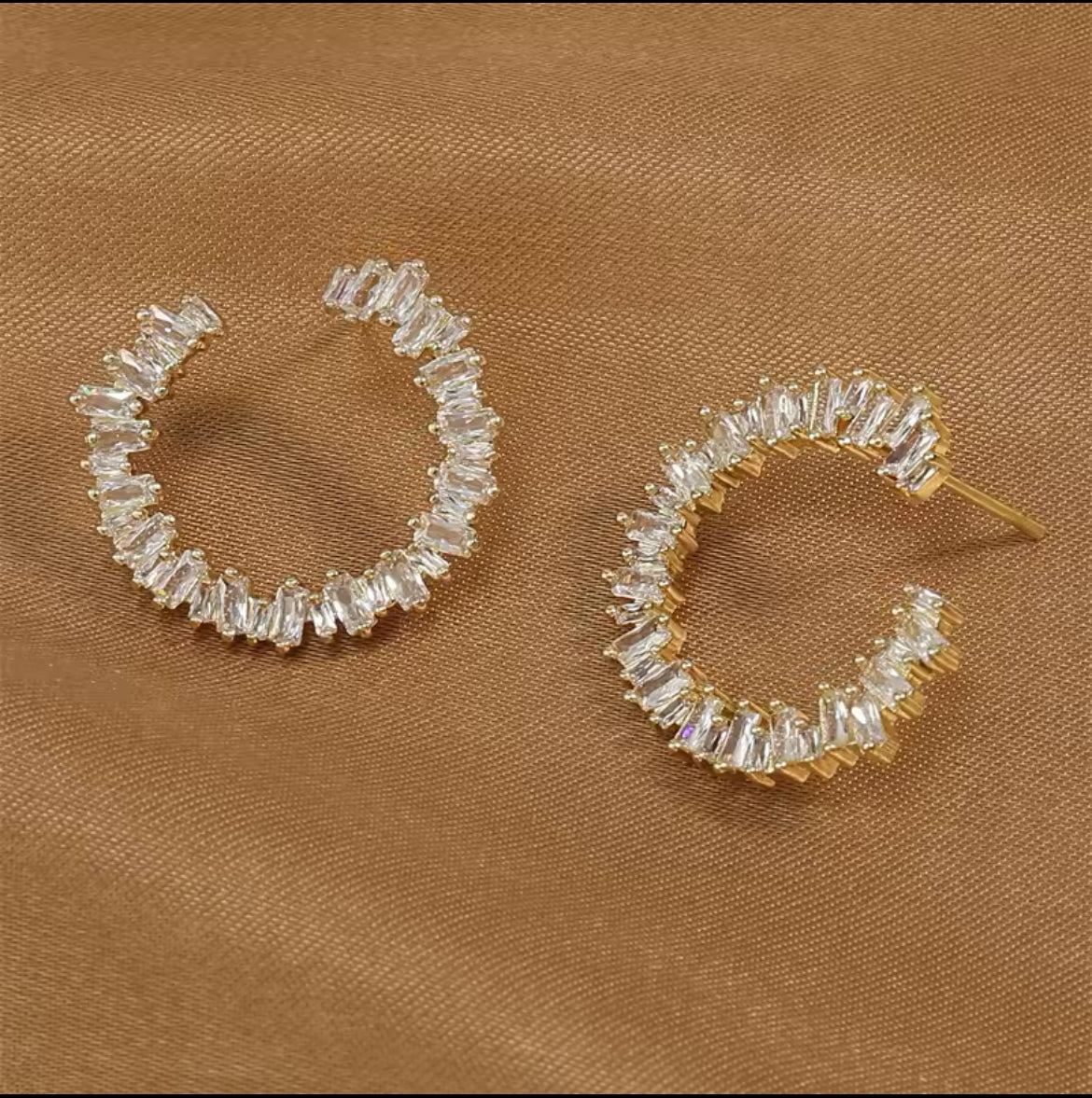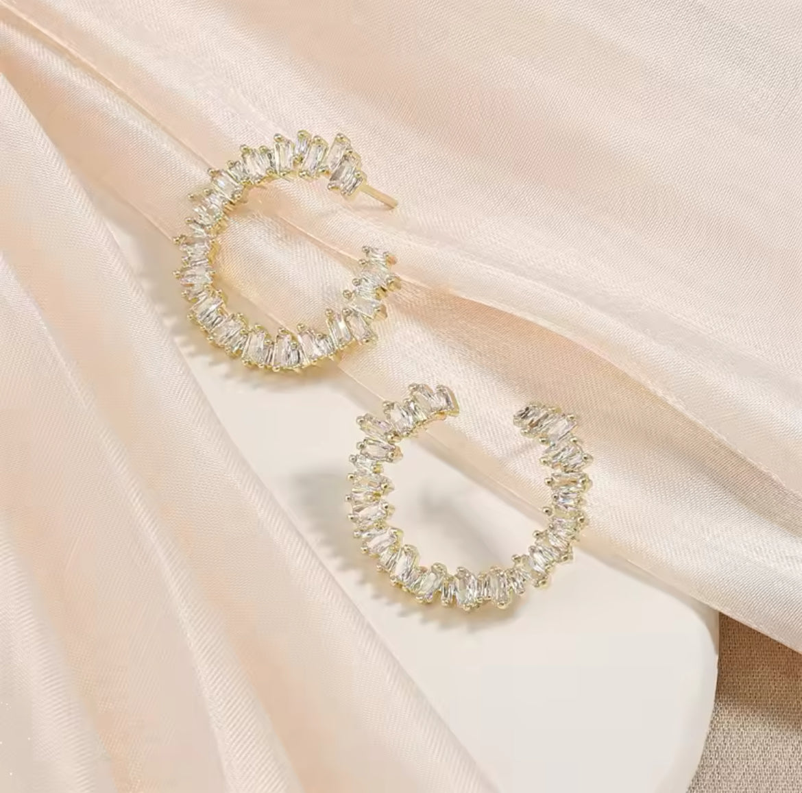 A pair of hoops, features small baguette-cut stones, sparkling appearance, modern and elegant design.