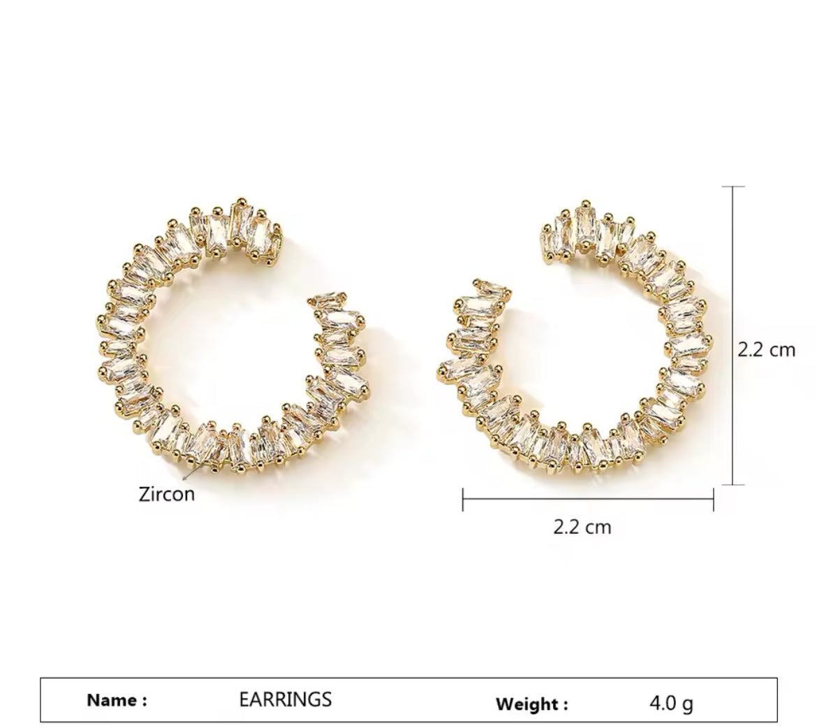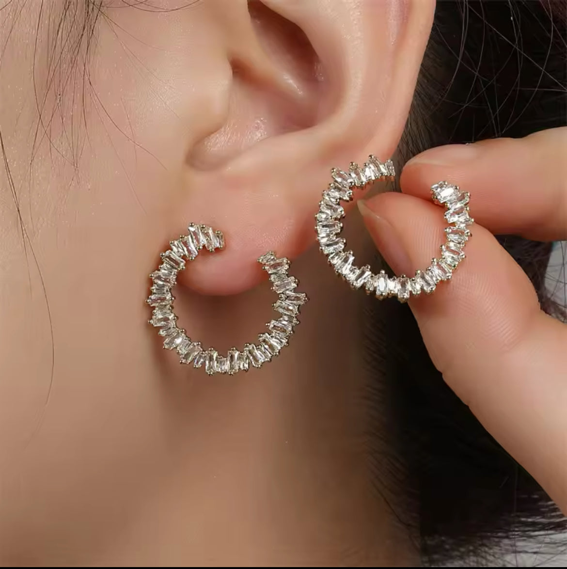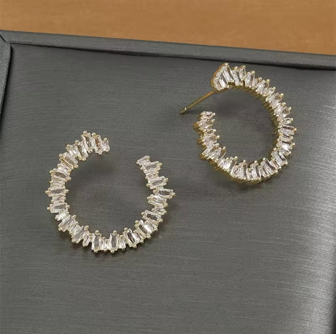 A pair of hoops, features small baguette-cut stones, sparkling appearance, modern and elegant design.
