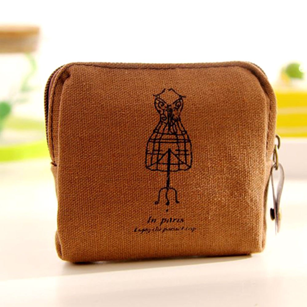 A small textured brown pouch with a zipper, featuring a dress form illustration and Parisian-themed text, blending charm and practicality.