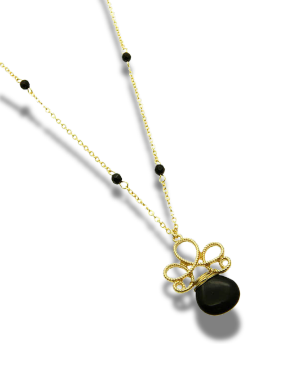 A refined gold necklace accented with sleek black beads, featuring a teardrop-shaped black pendant wrapped in elegant gold detailing-simple yet striking.