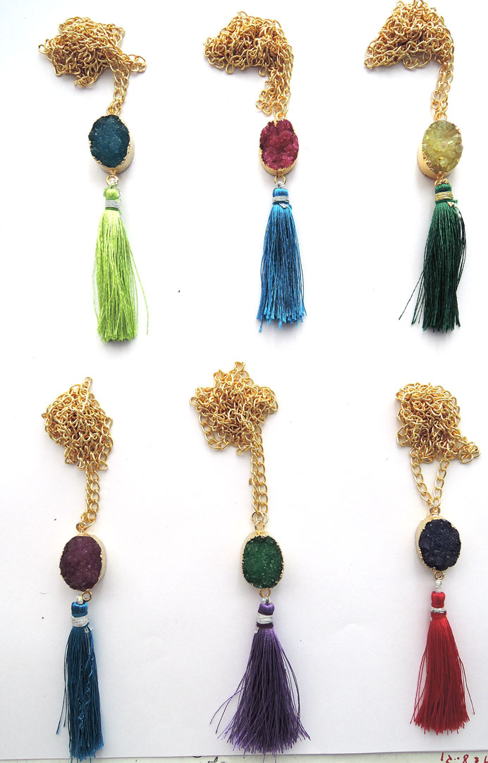 Six necklaces featuring gold chains with colorful oval pendants, each paired with a coordinating tassel, exuding vibrant charm and stylish elegance.