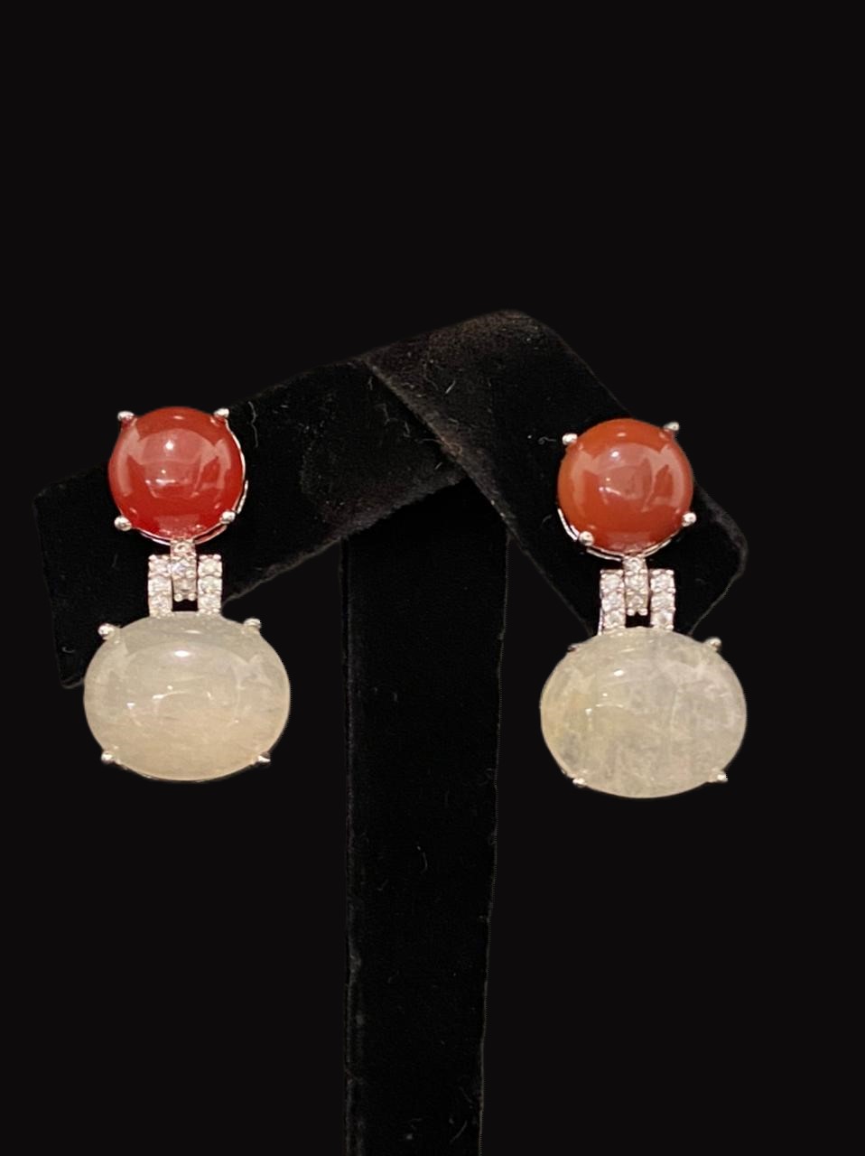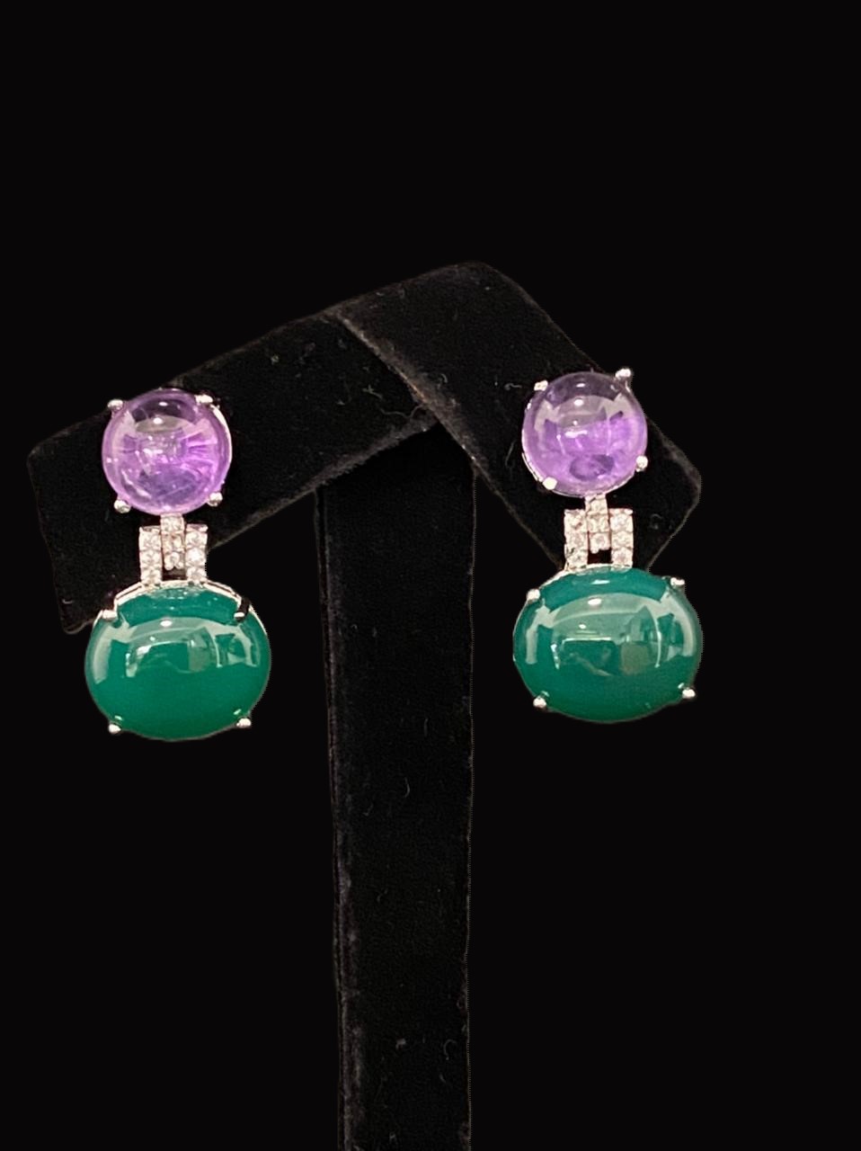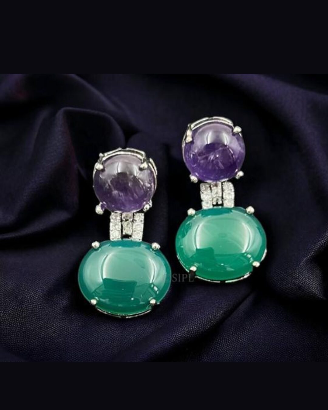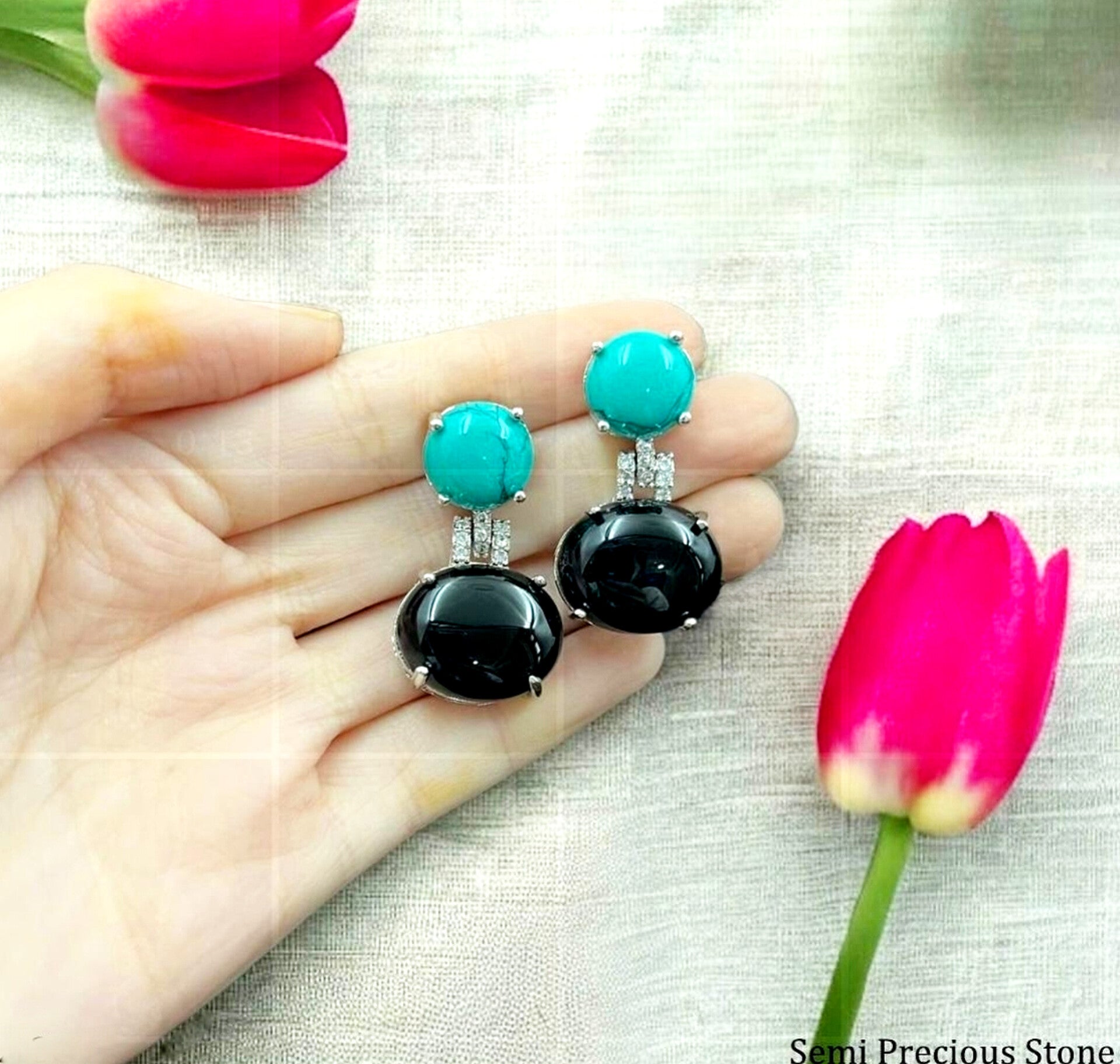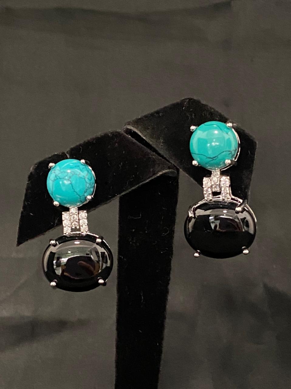 Elegant drop earrings with turquoise and black onyx stones, accented by sparkling white crystals in a sleek silver setting.
