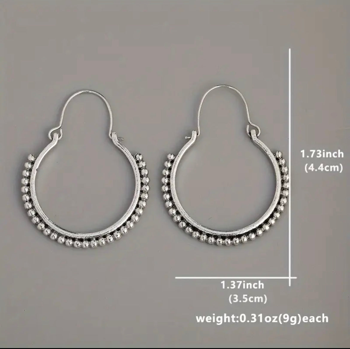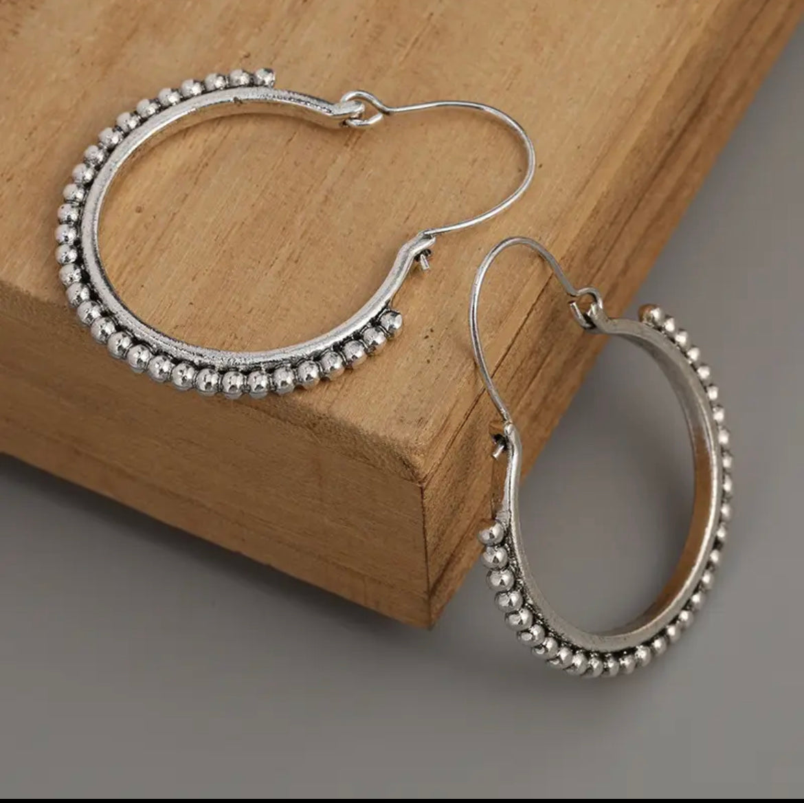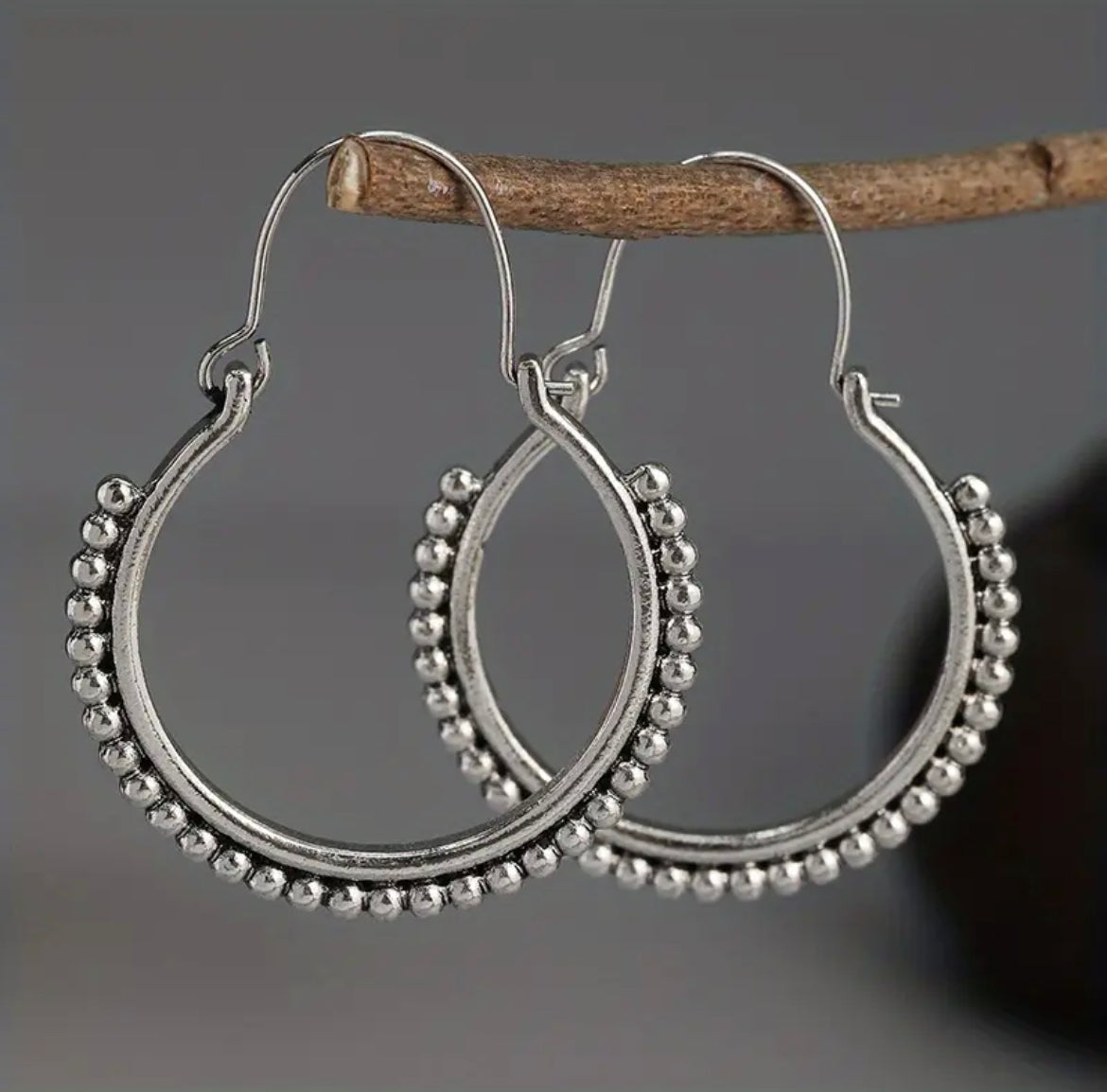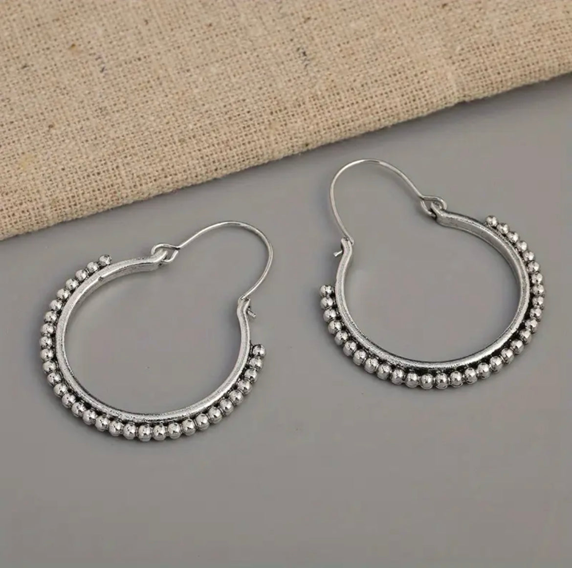 Vintage tribal silver hoop earrings, boho and hippie style, suitable for everydaywear.