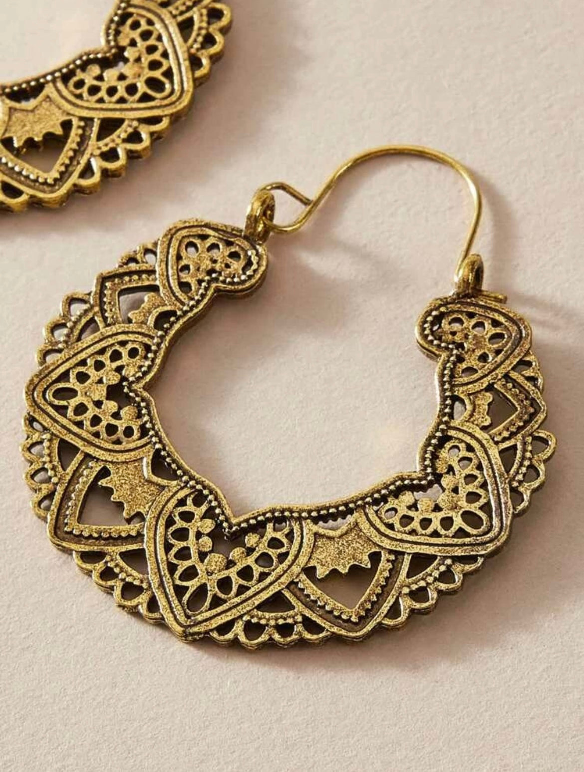 The earrings made of gold-toned metal and exhibit a boho and vintage style, decorative appearance.