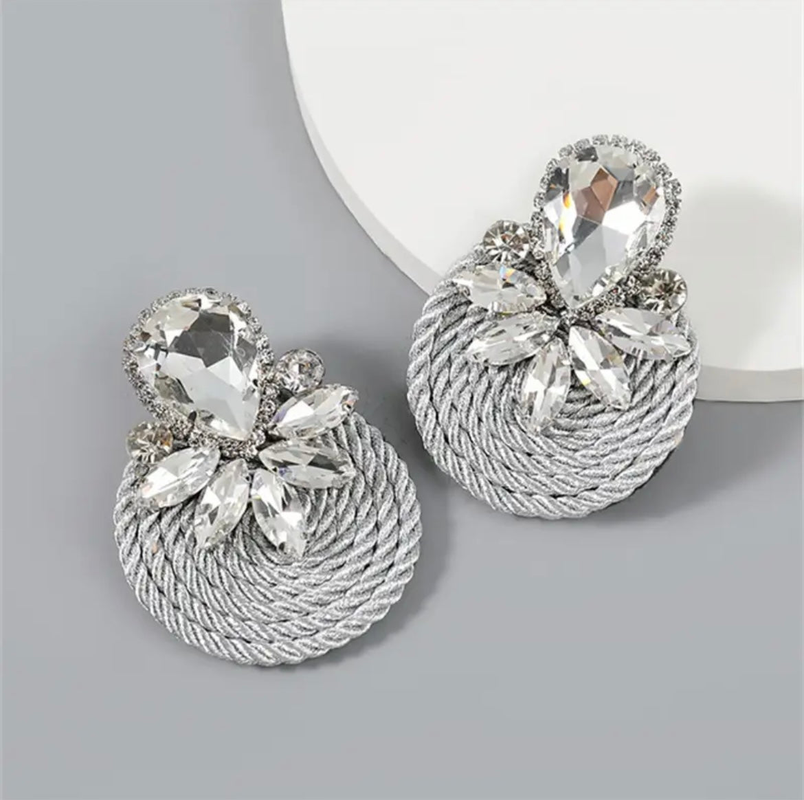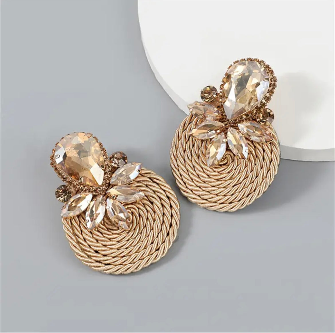 Elevate your look with these elegant statement earrings featuring a textured braided circular base adorned with crystals. The perfect blend of glam and craftsmanship, these earrings add a touch of sophistication to any outfit - ideal for weddings, parties, or chic everyday flair.