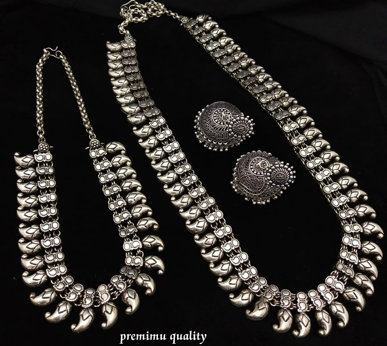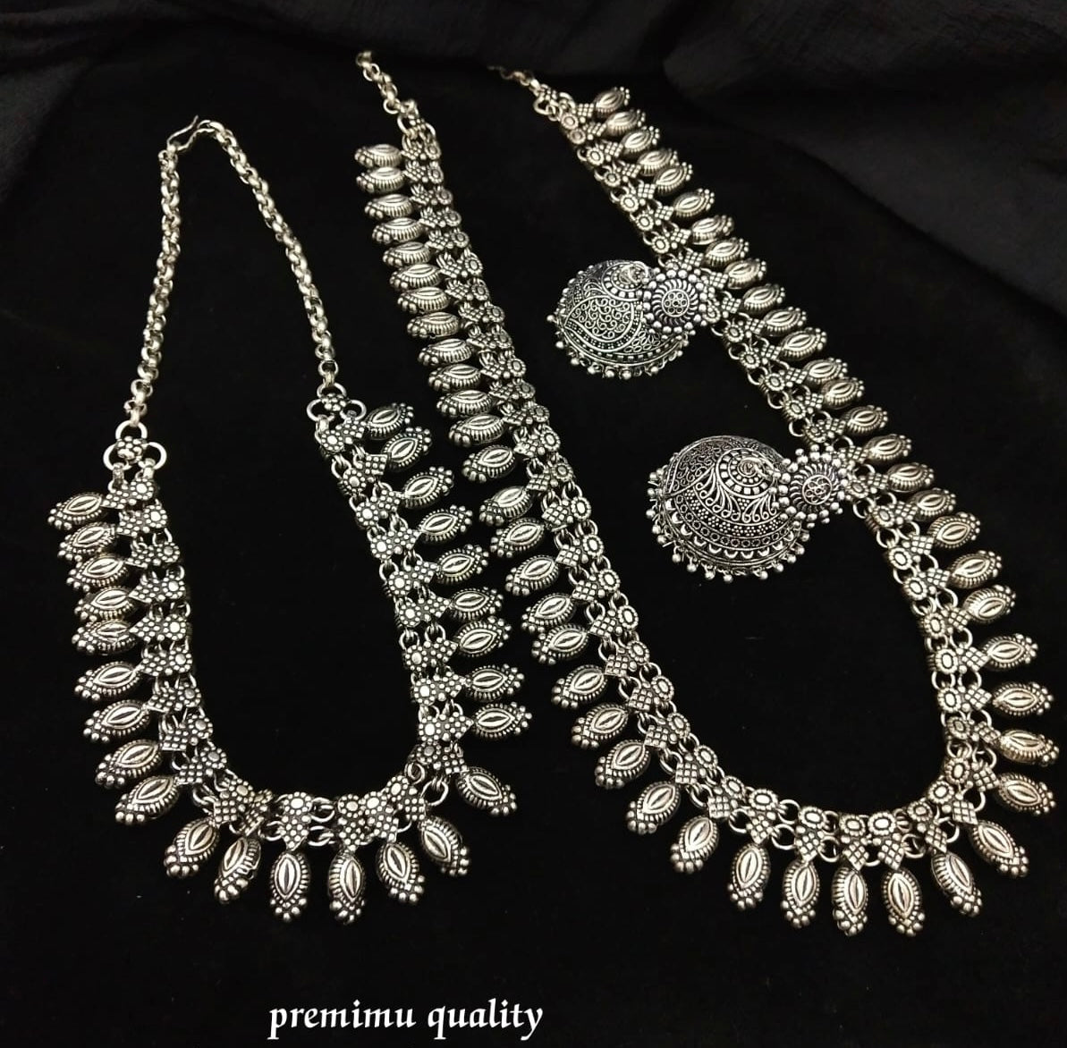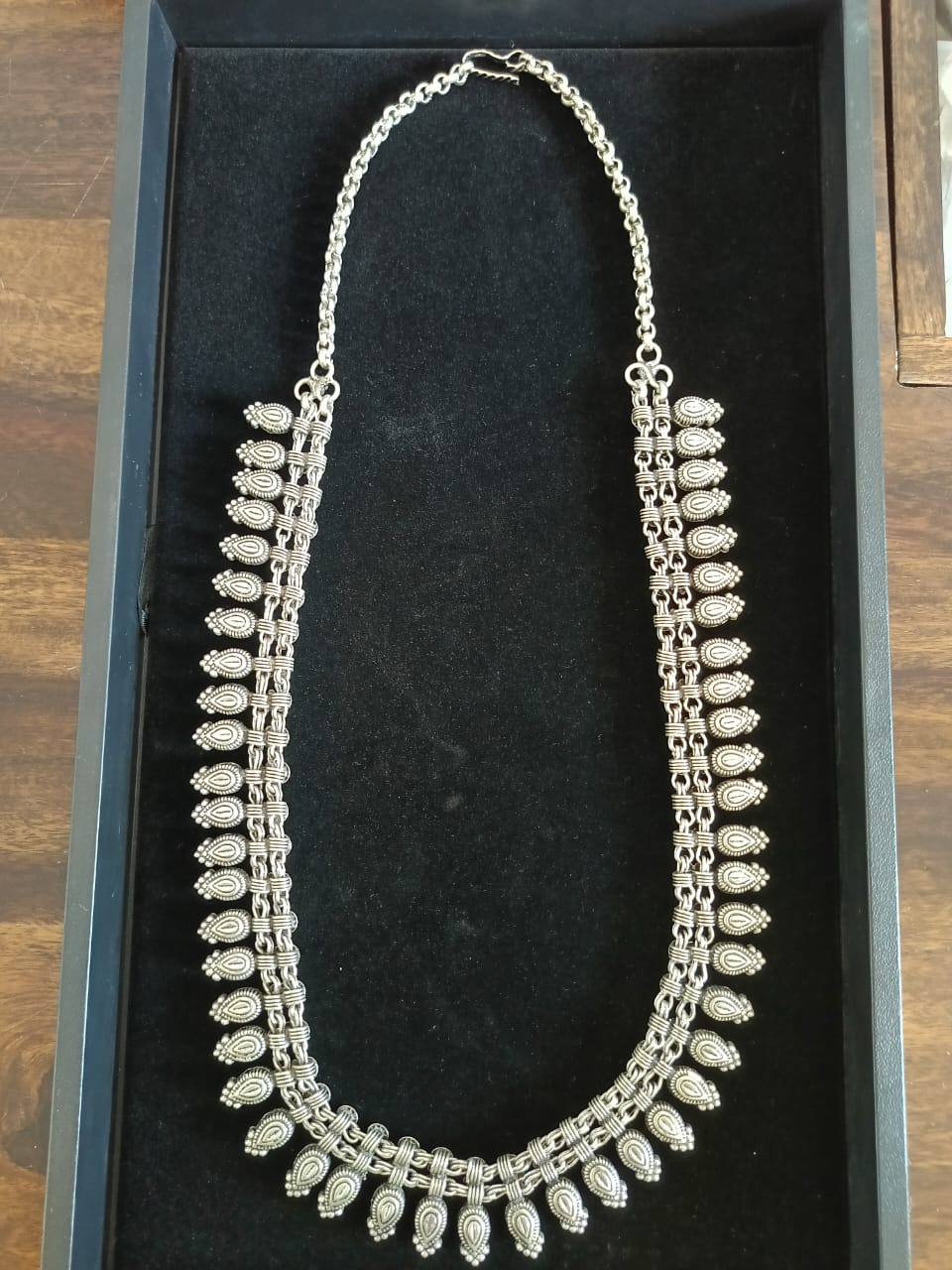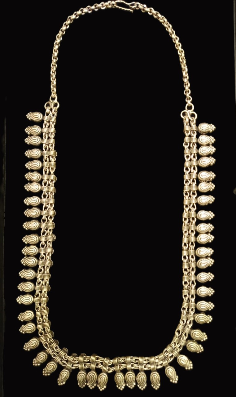 This bold tribal-inspired necklace features intricate antique silver detailing with dual-layered motifs and textured links, creating a rich, statement-making silhouette. Ideal for ethnic ensembles or adding character to modern looks.