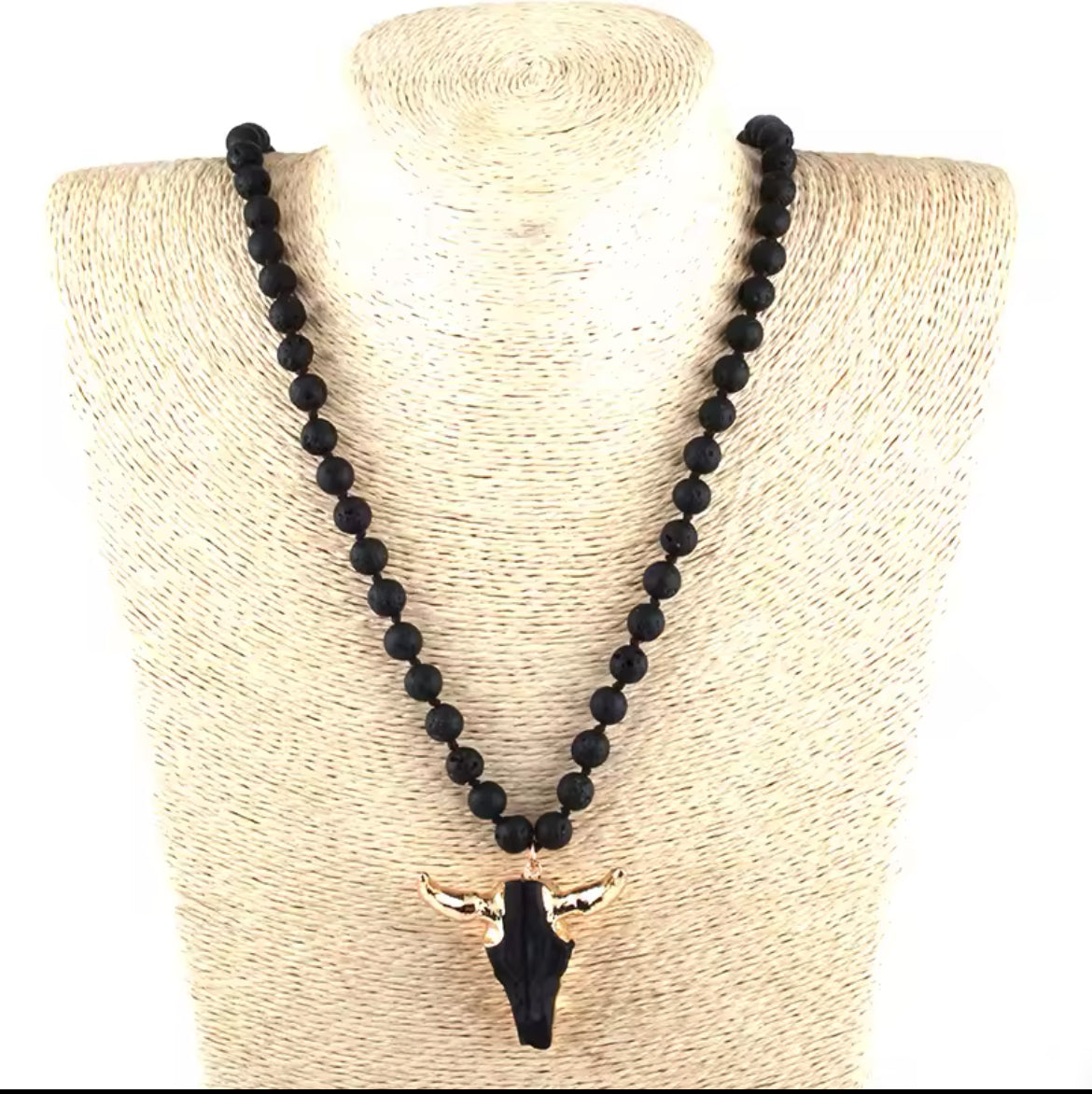 This necklace features a string of black, round beads, necklace is long and pendant is shaped like bull"s head.