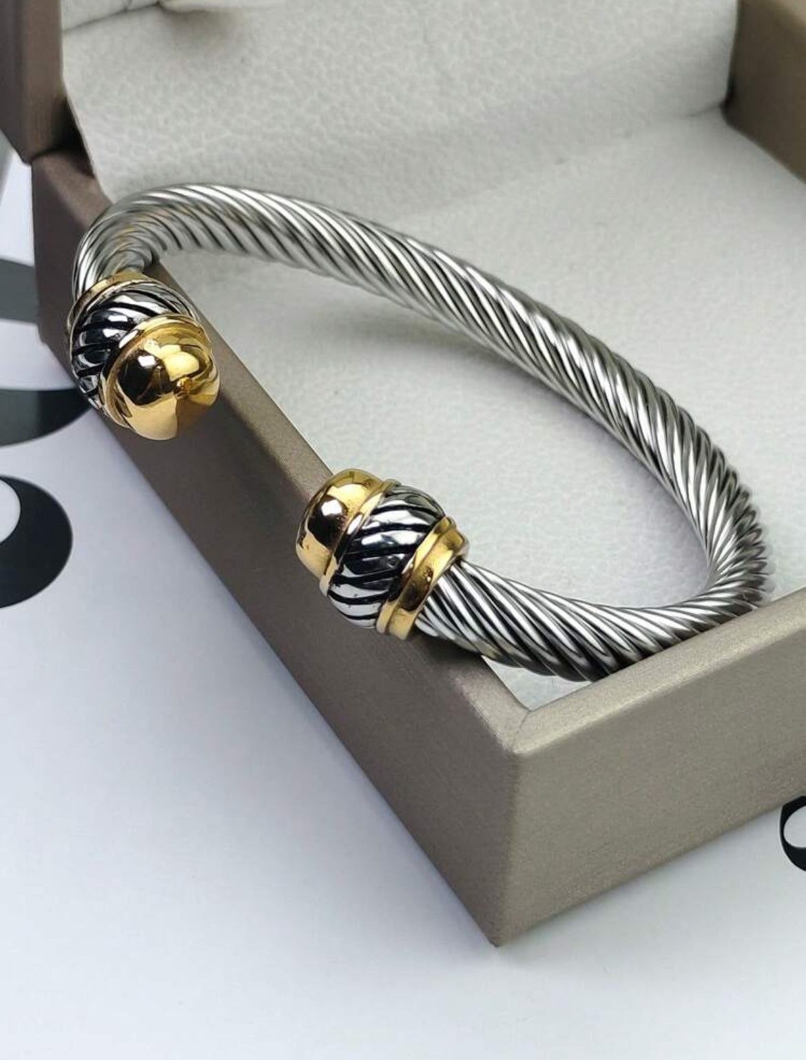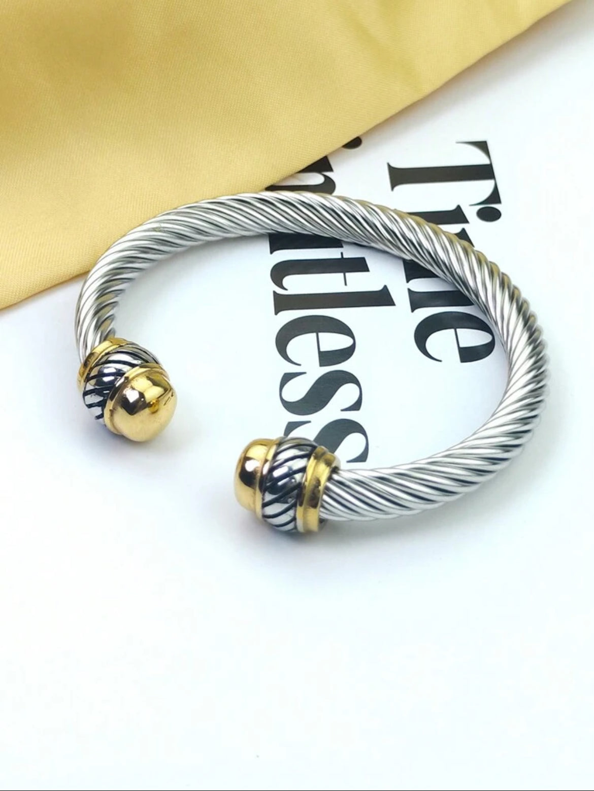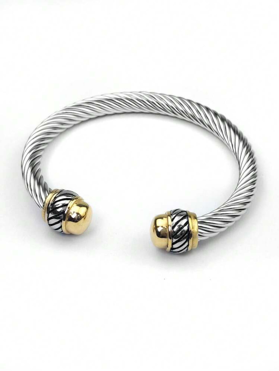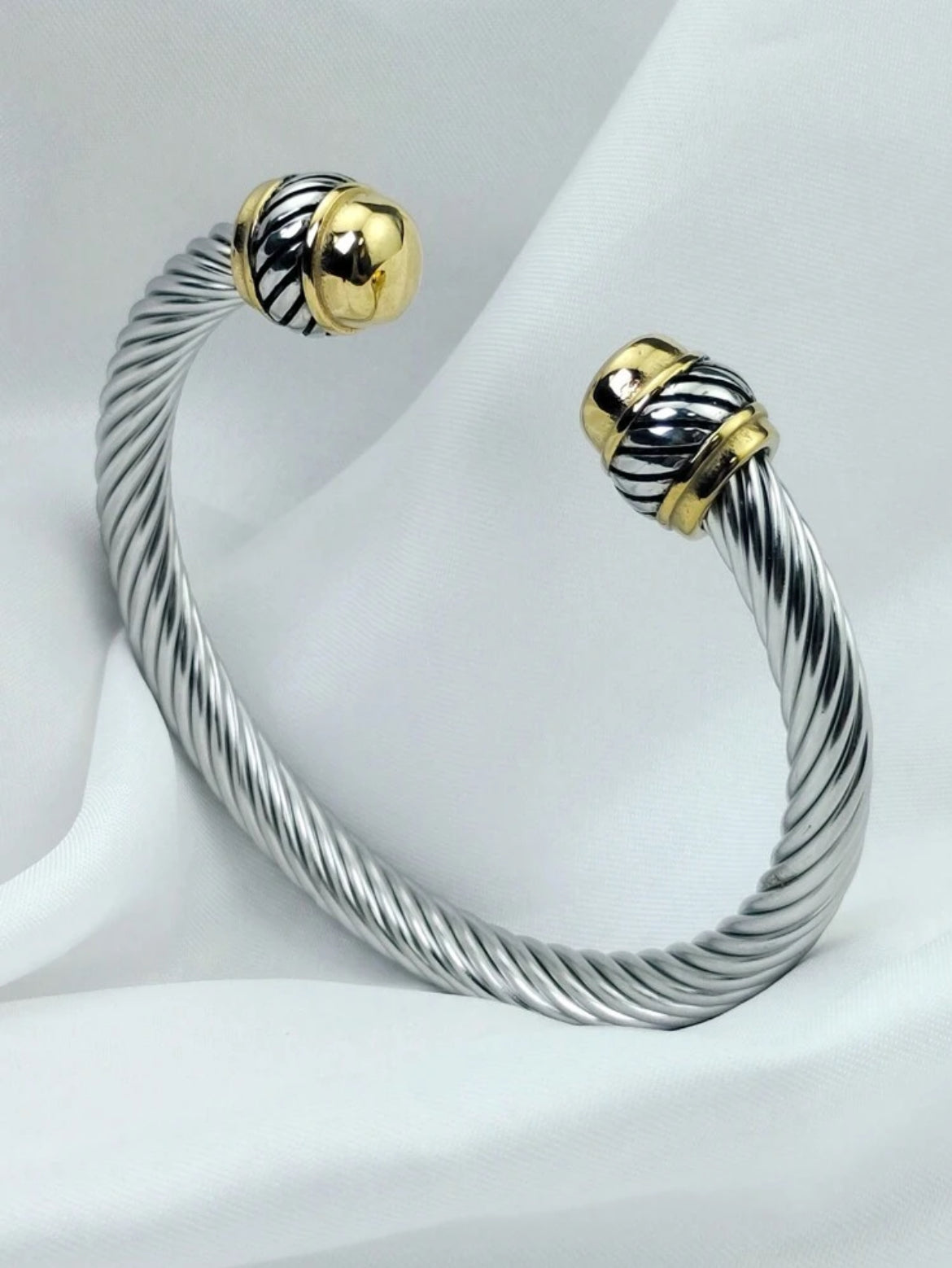 Open-ended style with bulbous and has a bright,polished silver tone.