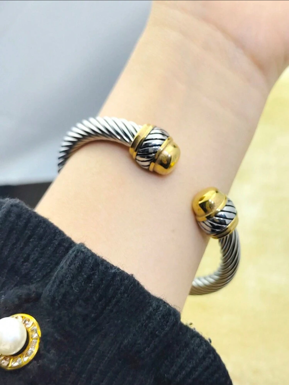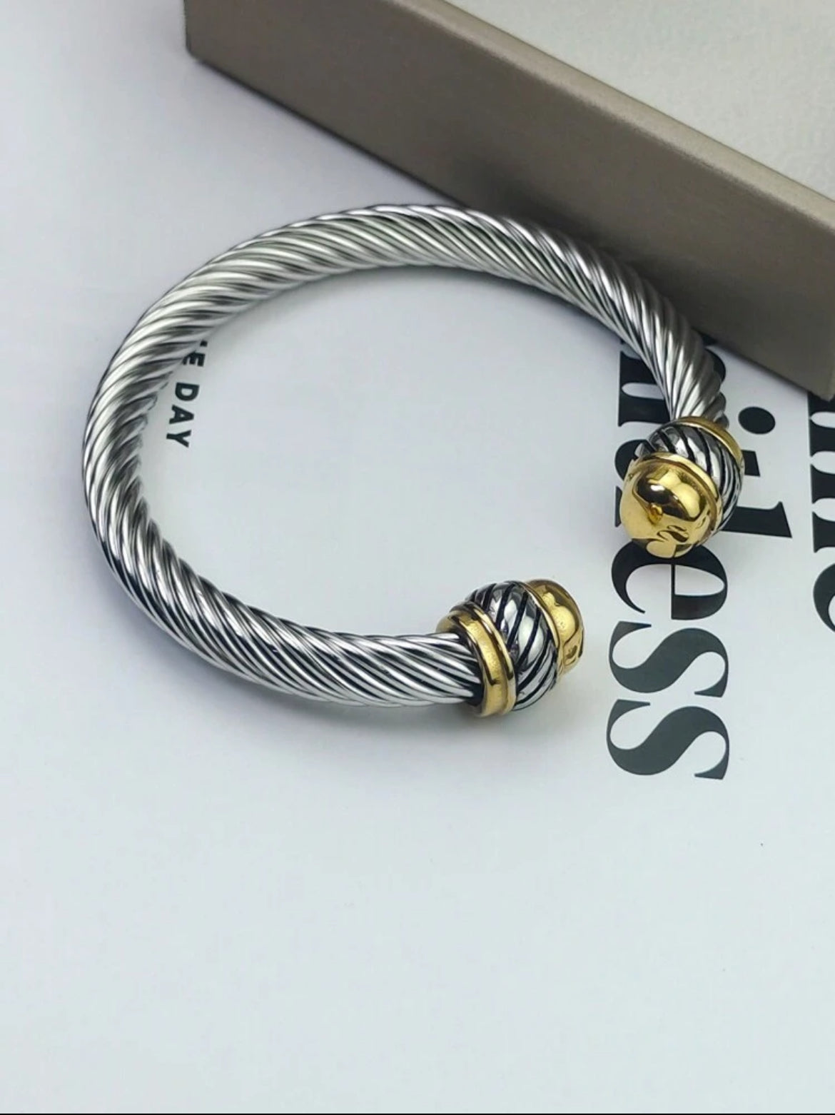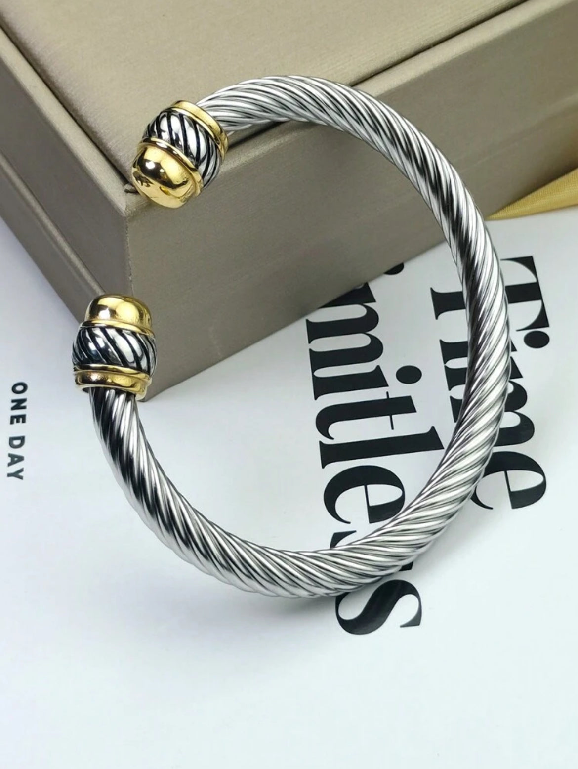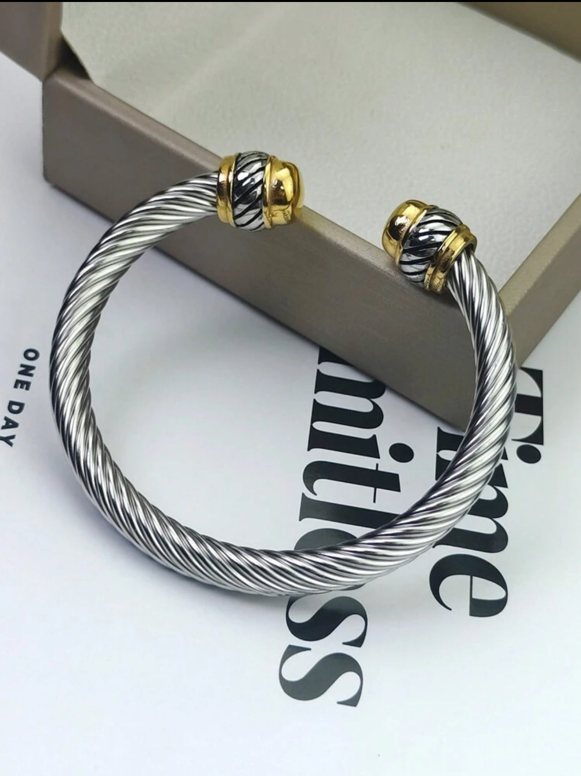 Open-ended style with bulbous and has a bright,polished silver tone.