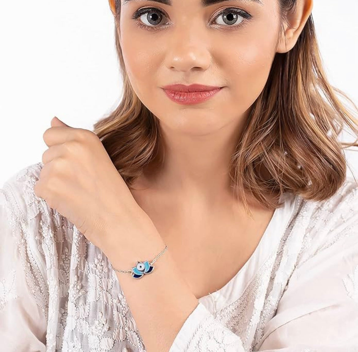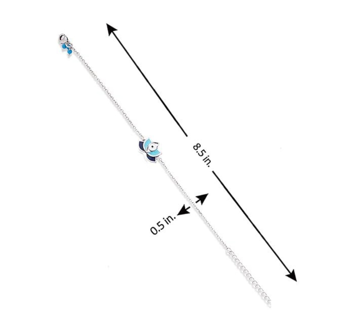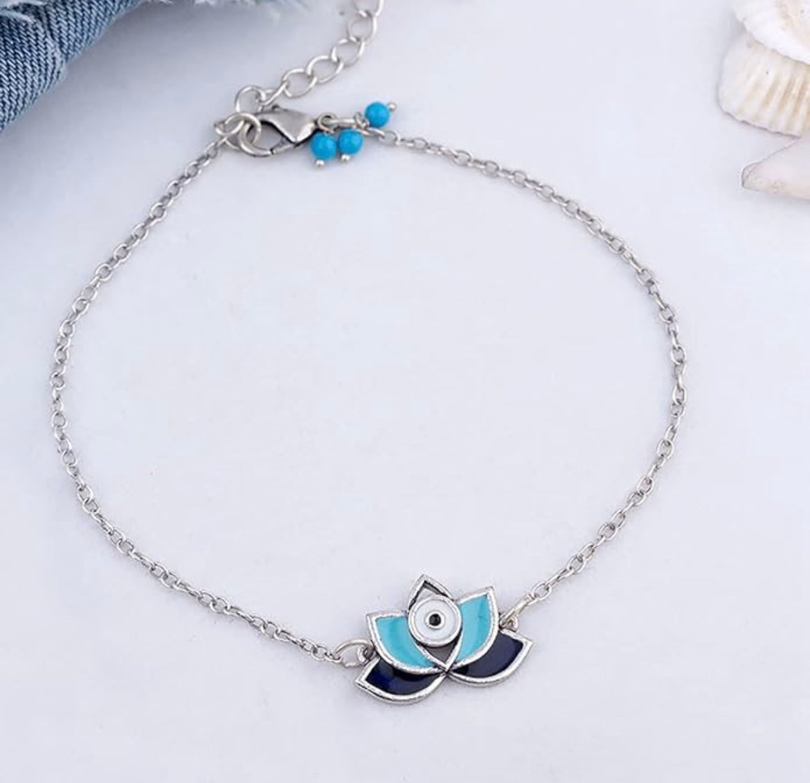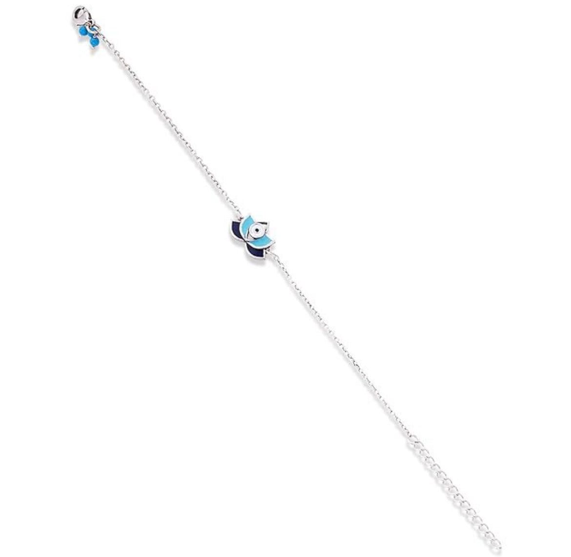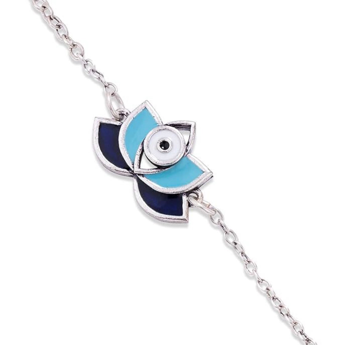 A delicate silver lotus flower pendant with blue and white petals, anchored by a central eye motif-serene and sophisticated.
