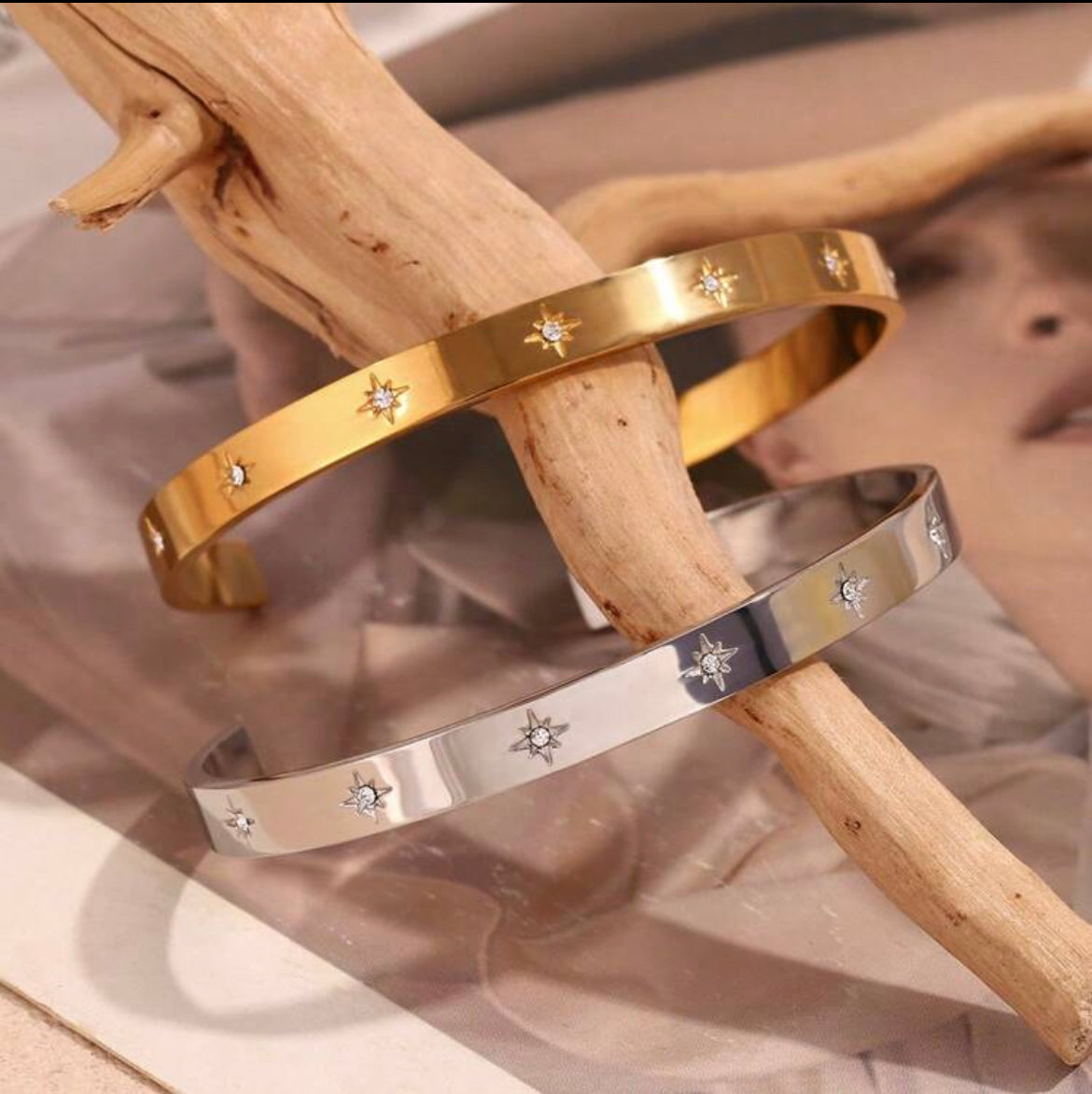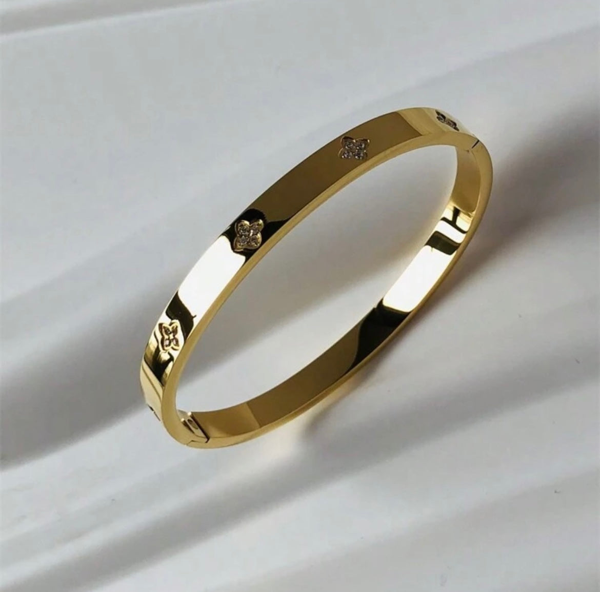 The bracelet is a gold-colored bangle with leaf clover design, encrusted with small stones,made of polished metal.