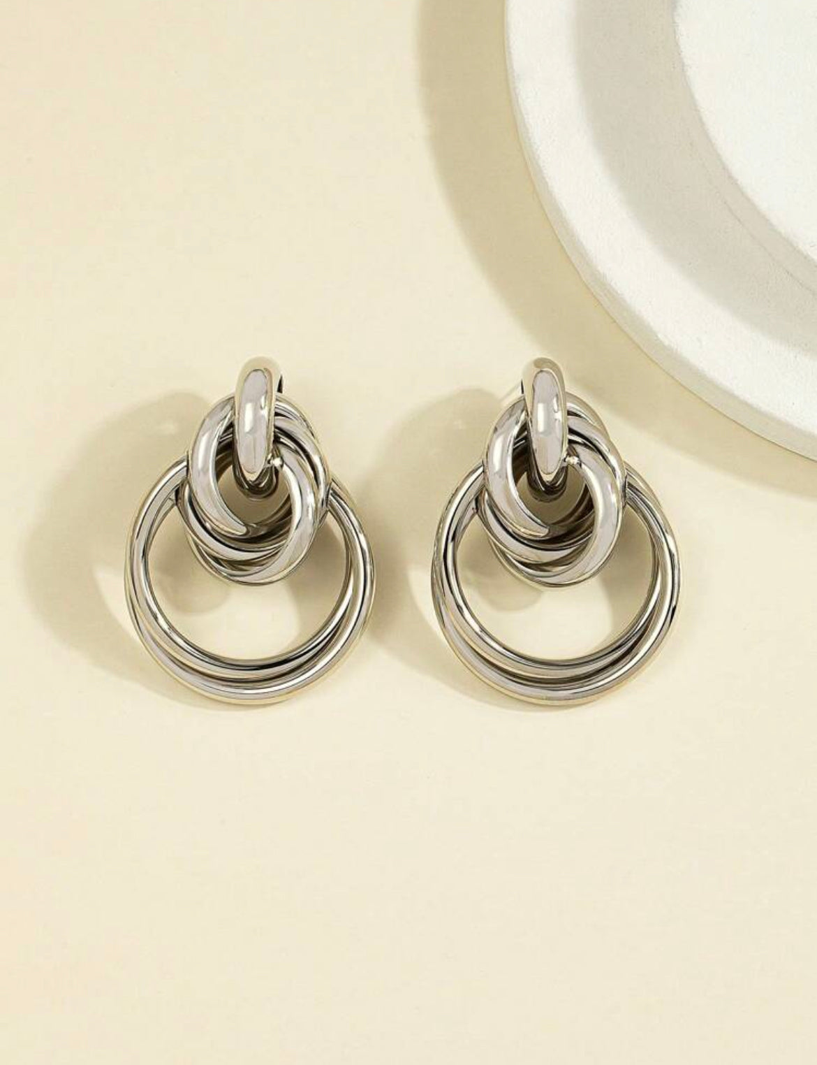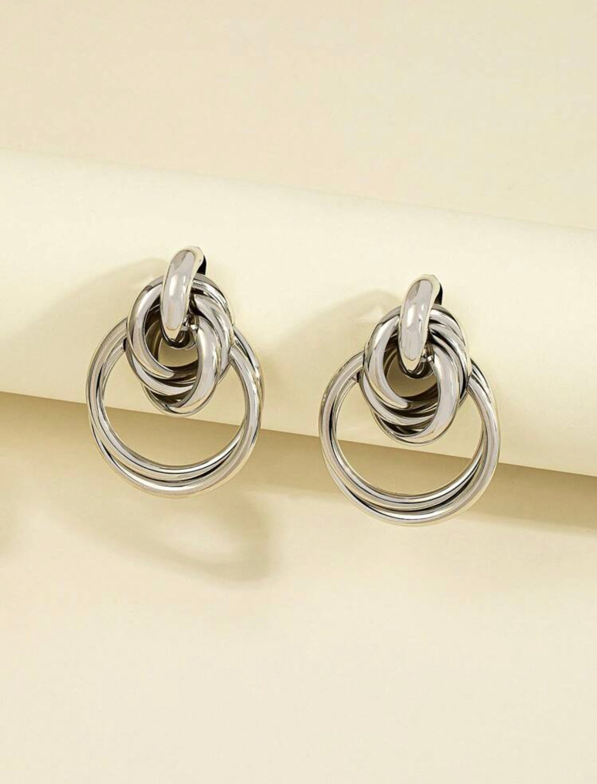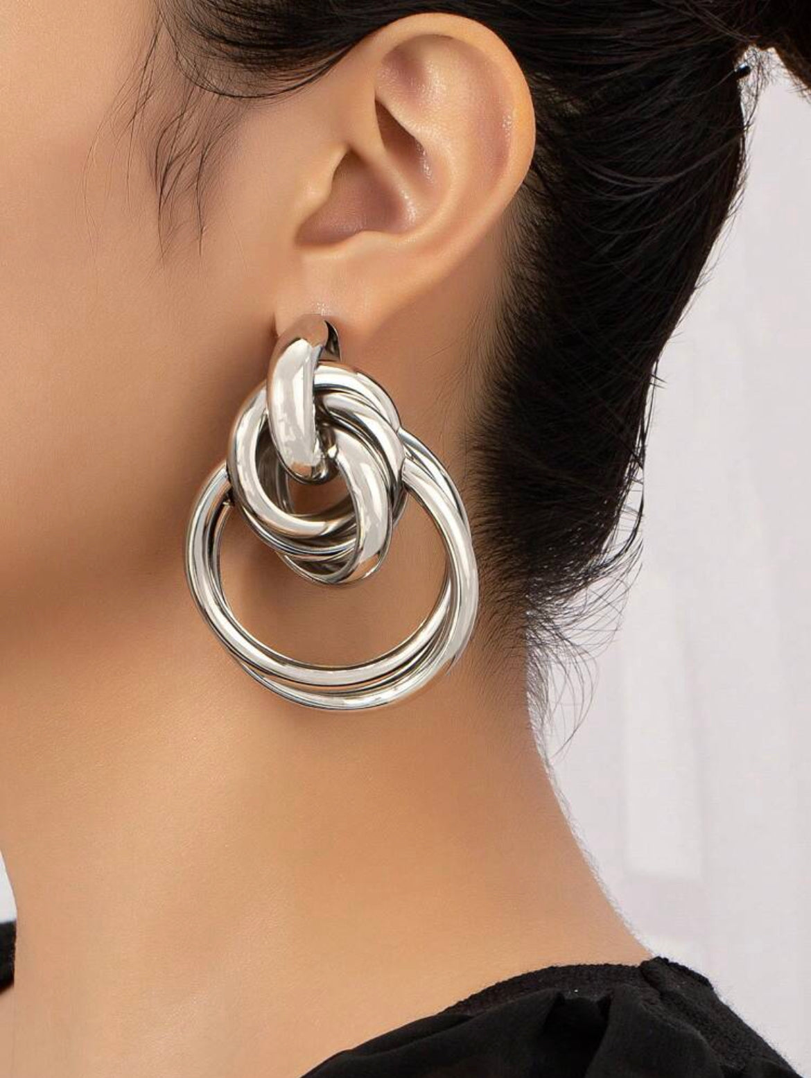 The earring is a silver-colored, chunky piece of jewelry, an interwined design, eye-catching appearance.