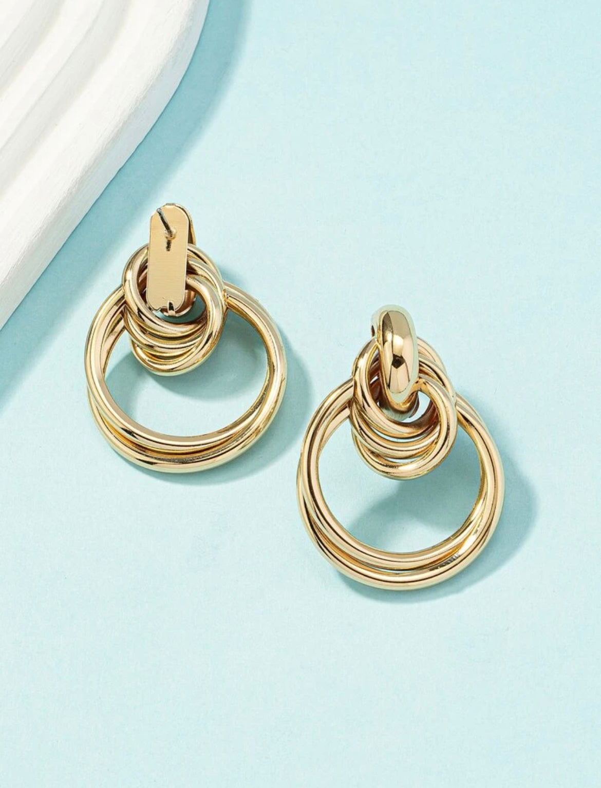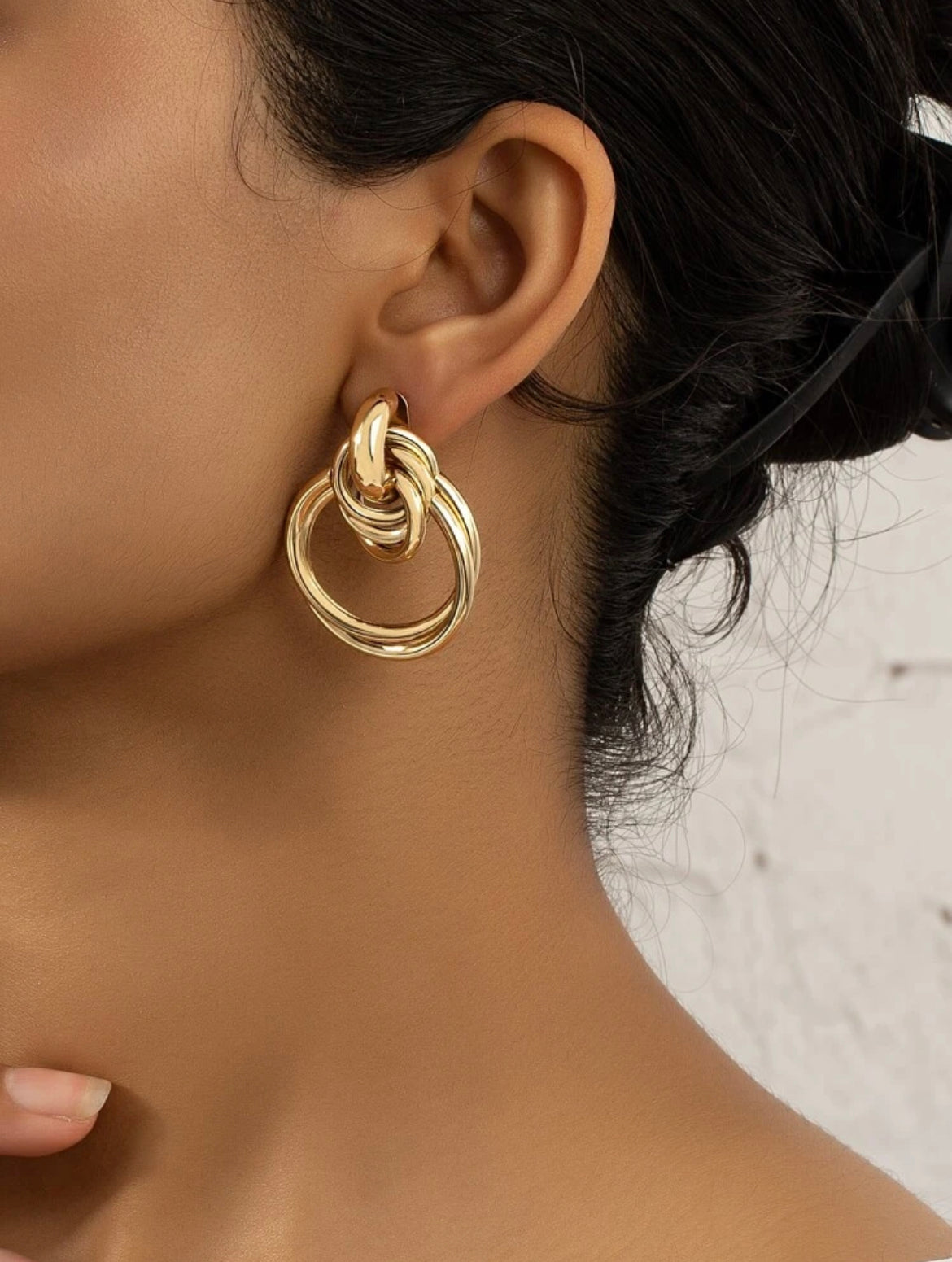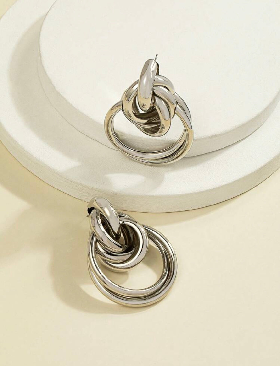 The earring is a silver-colored, chunky piece of jewelry, an interwined design, eye-catching appearance.