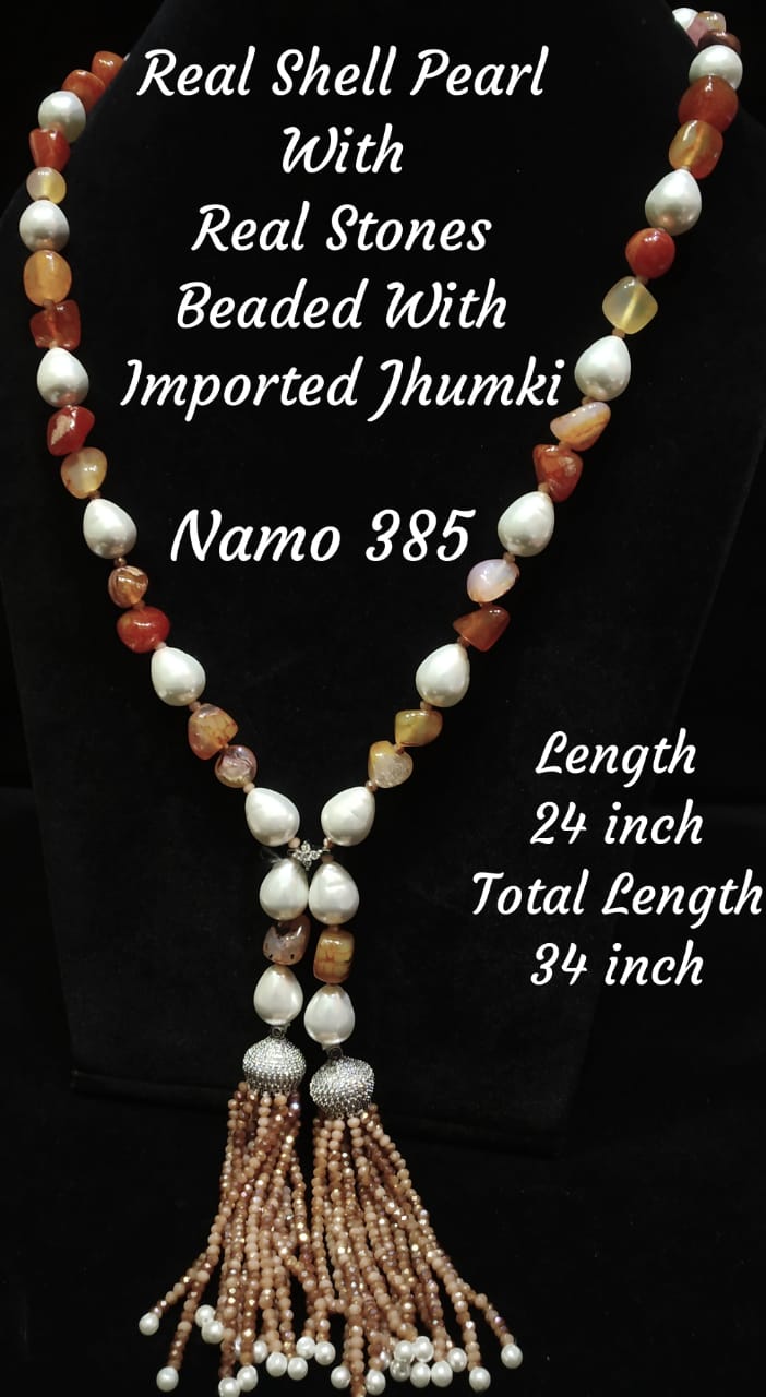 An elegant pearl necklace with imported jhumki beads and sparkling stones, radiating timeless sophistication.