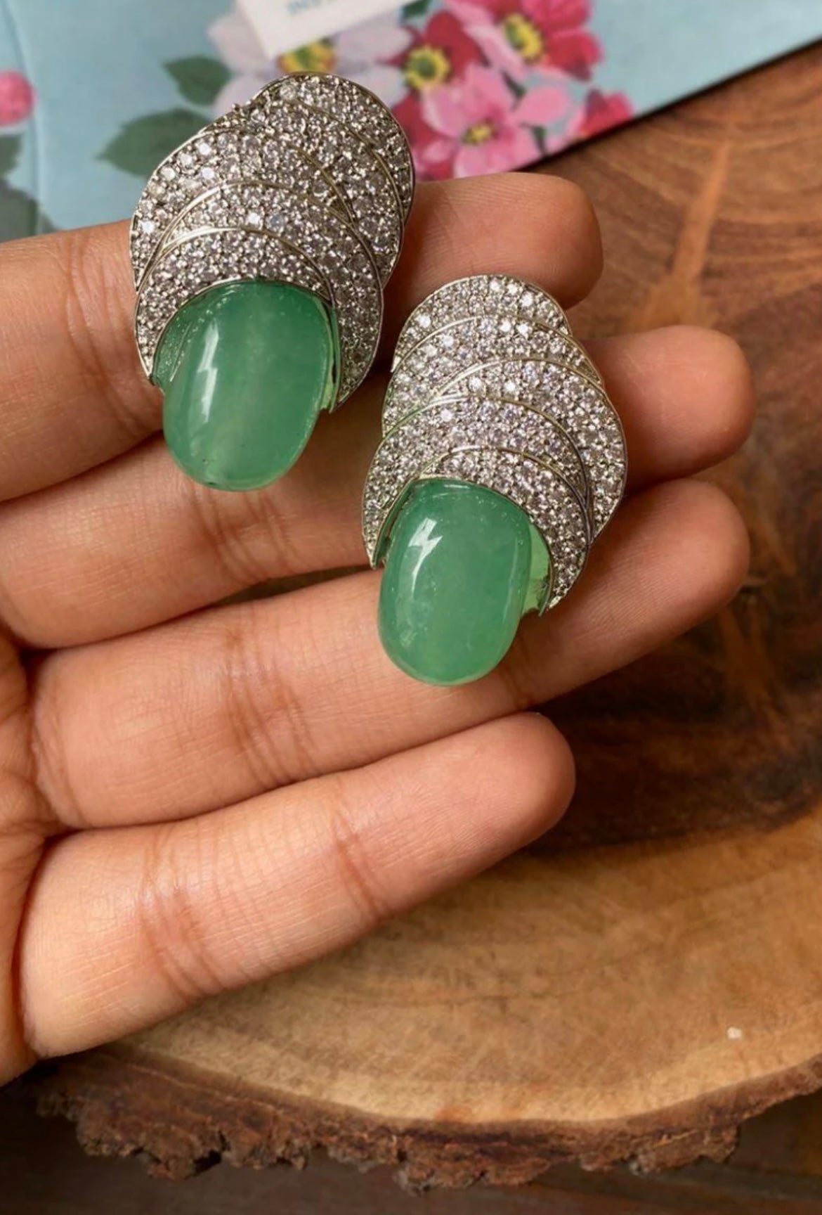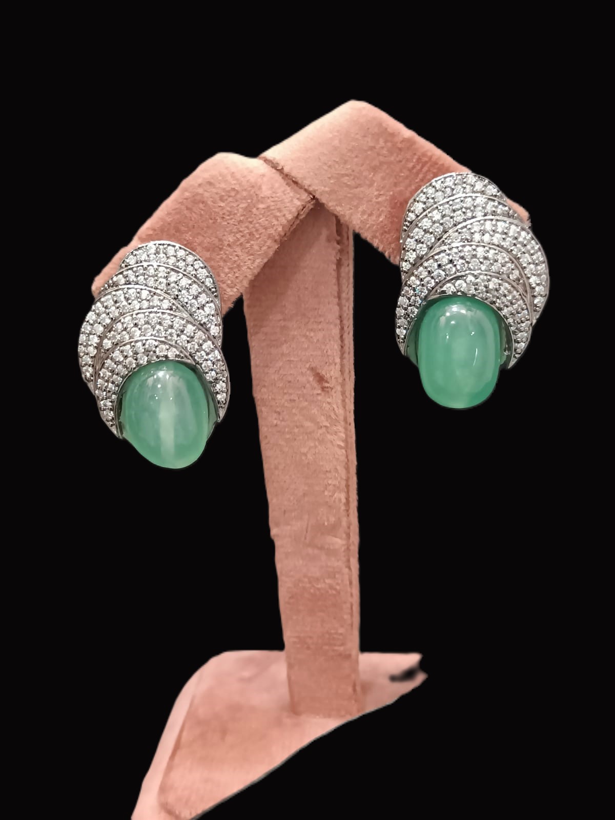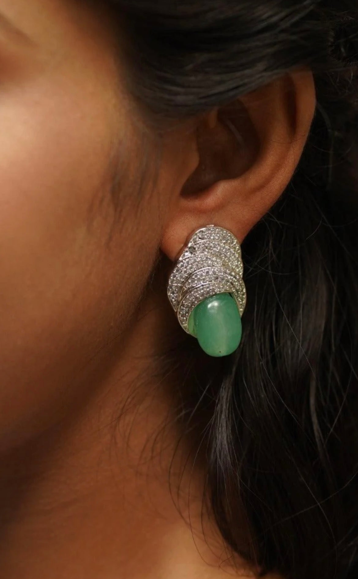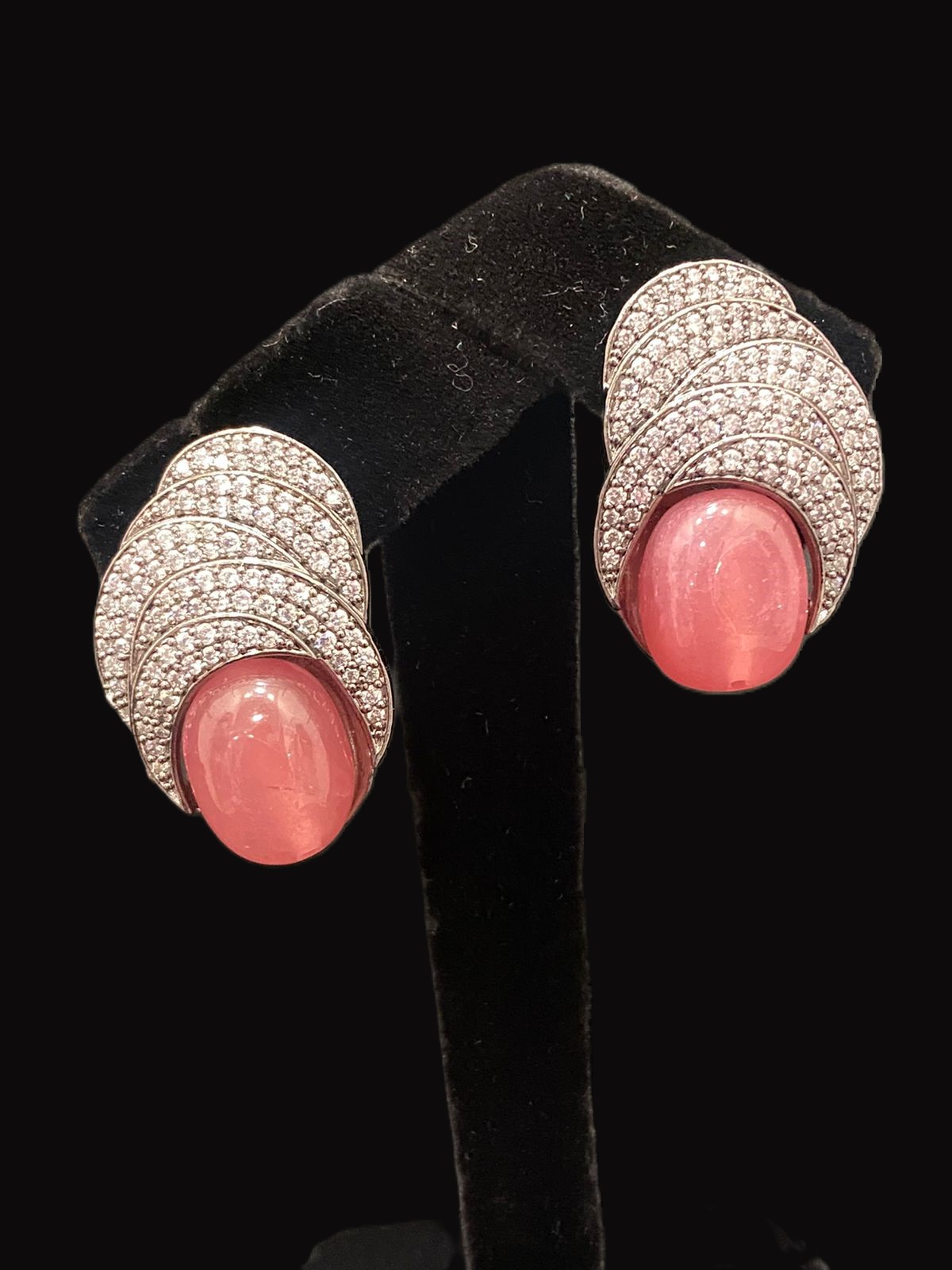 Elegant stud earrings feature a soft pink cabochon gemstone embraced by layered, pavé-set diamond curves, evoking the beauty of a delicate clam shell.