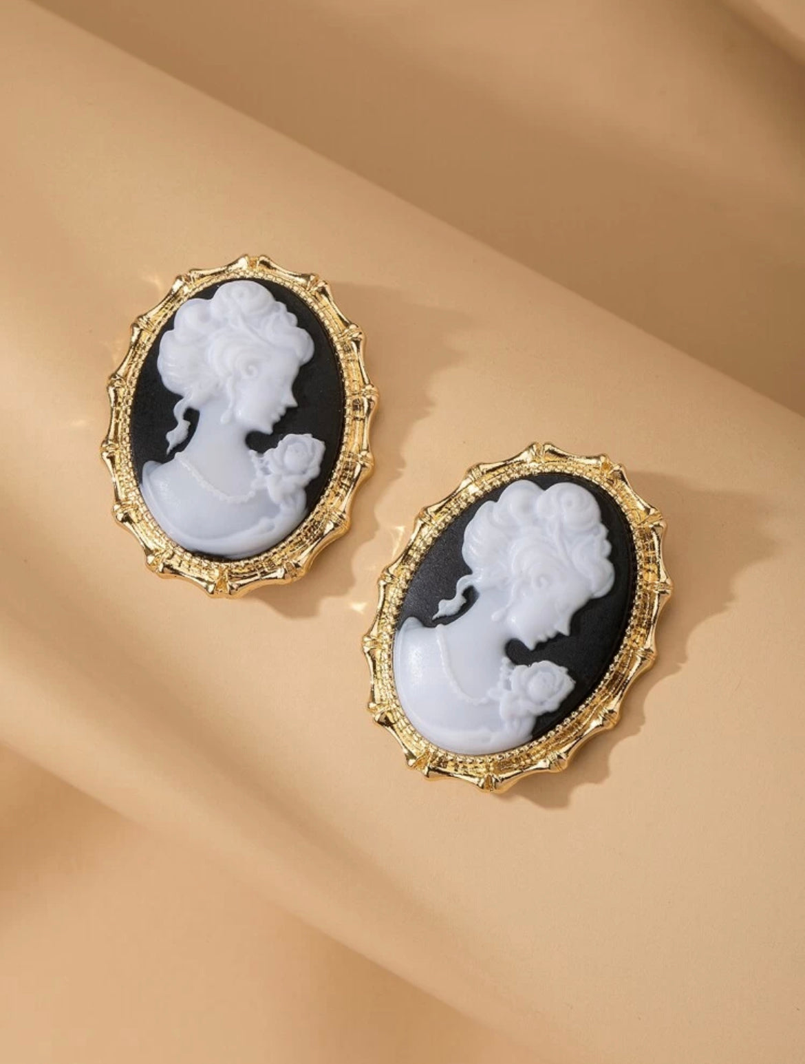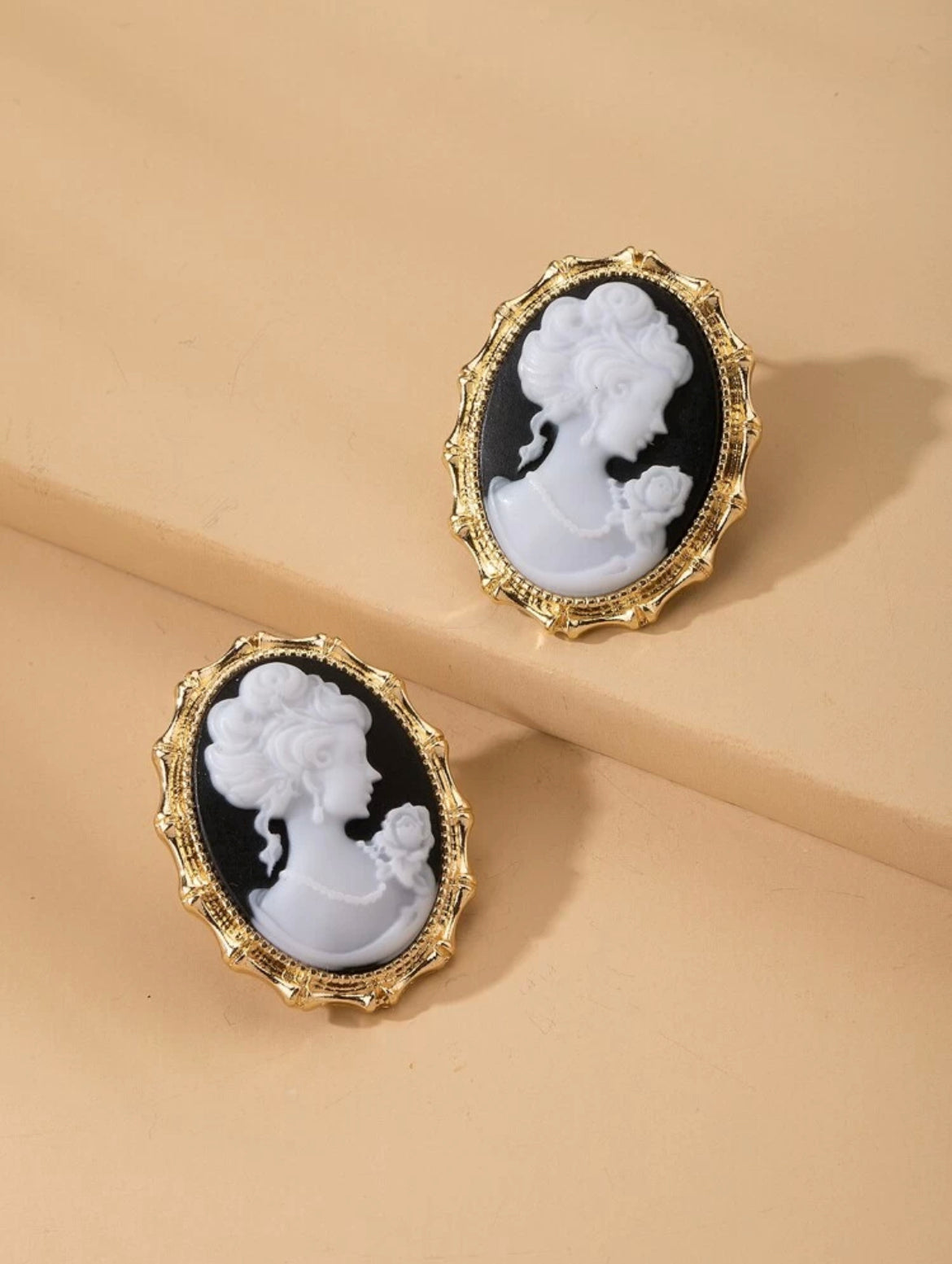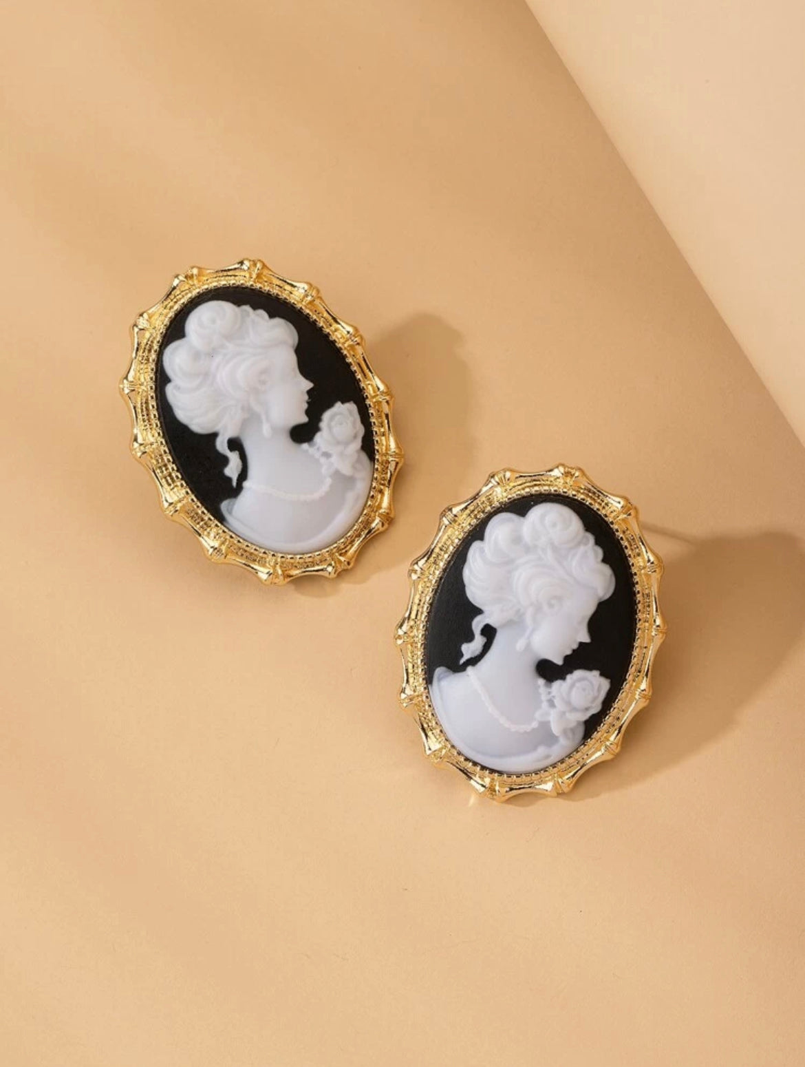 The earrings are vintage-style cameo pieces, have a textured edge and a scalloped design, classic design.