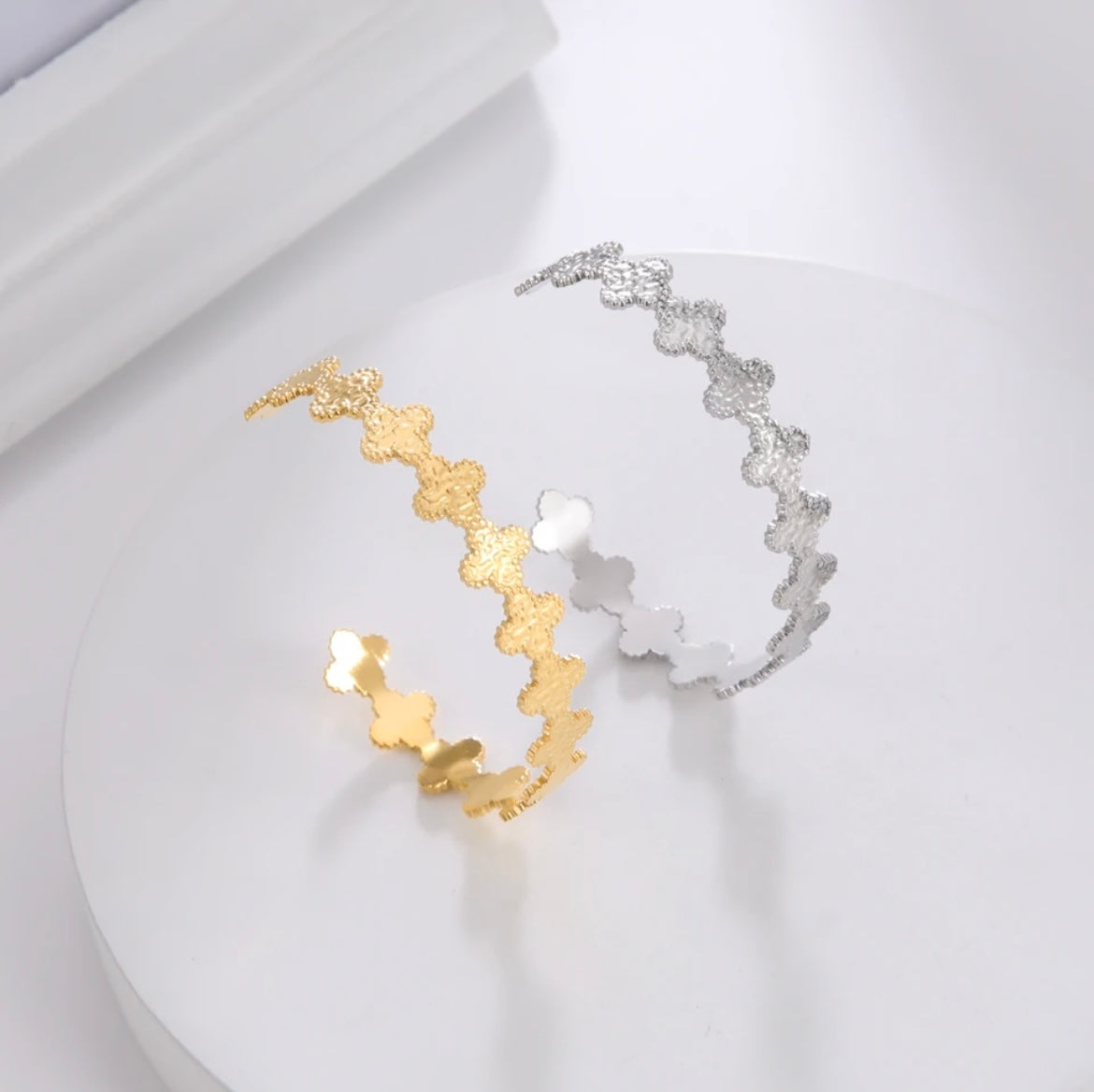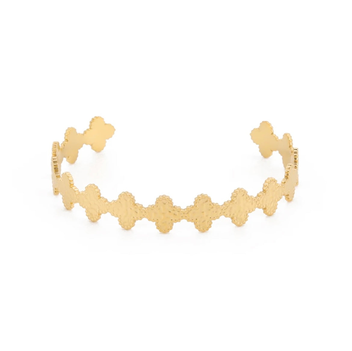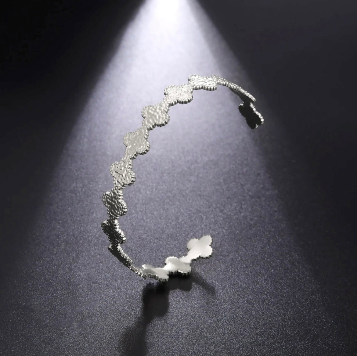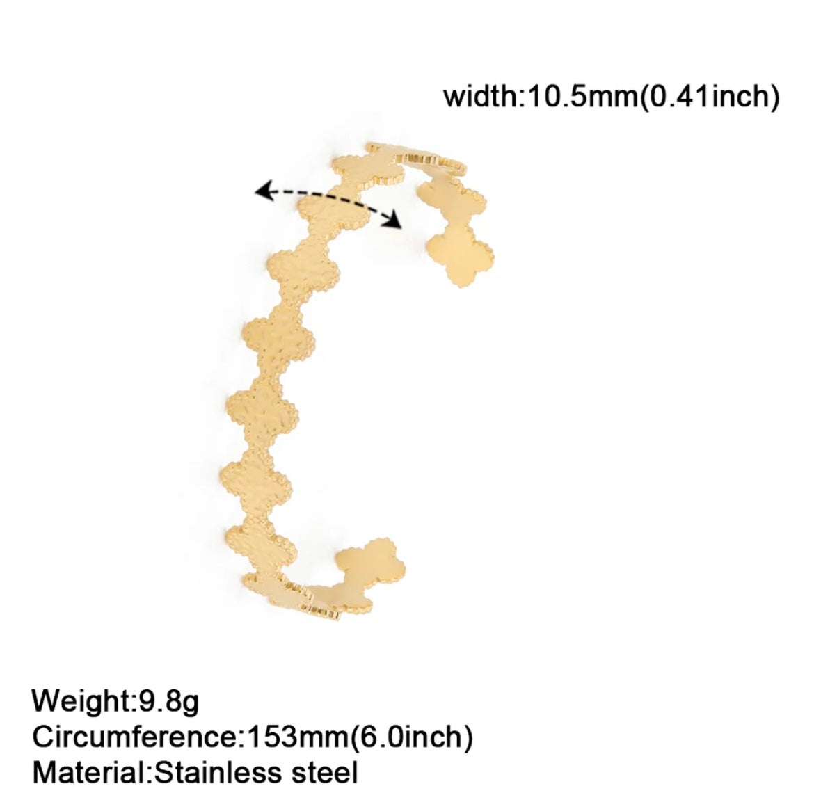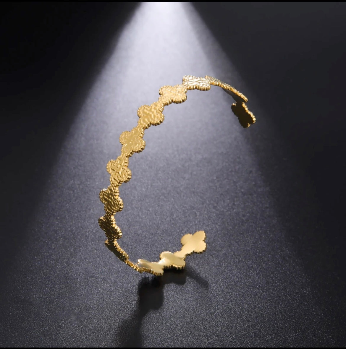 Plated, hammered texture, adjustable bangle, anti tarnish and made of stainless steel.