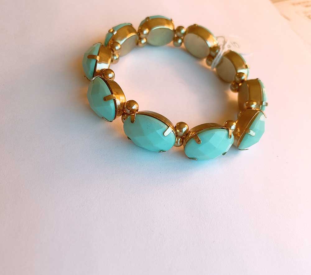 A turquoise bracelet with faceted oval stones set in gold frames, accented by delicate spherical details-vividly elegant.