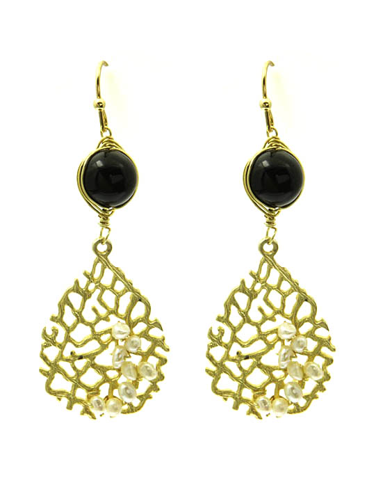 Gold earrings with black beads and teardrop filigree, adorned with dainty white pearls for an elegant touch.