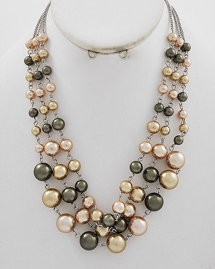 A luxurious multi-strand necklace featuring cascading pearls in gold, bronze, and peach tones, intricately linked for an elegant and sophisticated design.