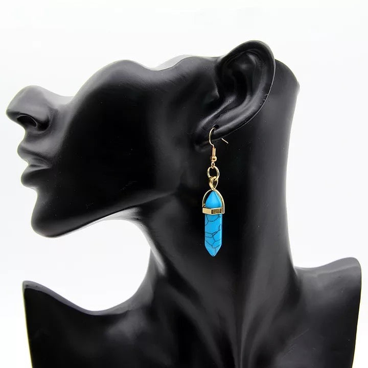 Drop earrings featuring marbled blue stones, capped in gold and suspended from sleek gold hooks, exuding modern elegance.