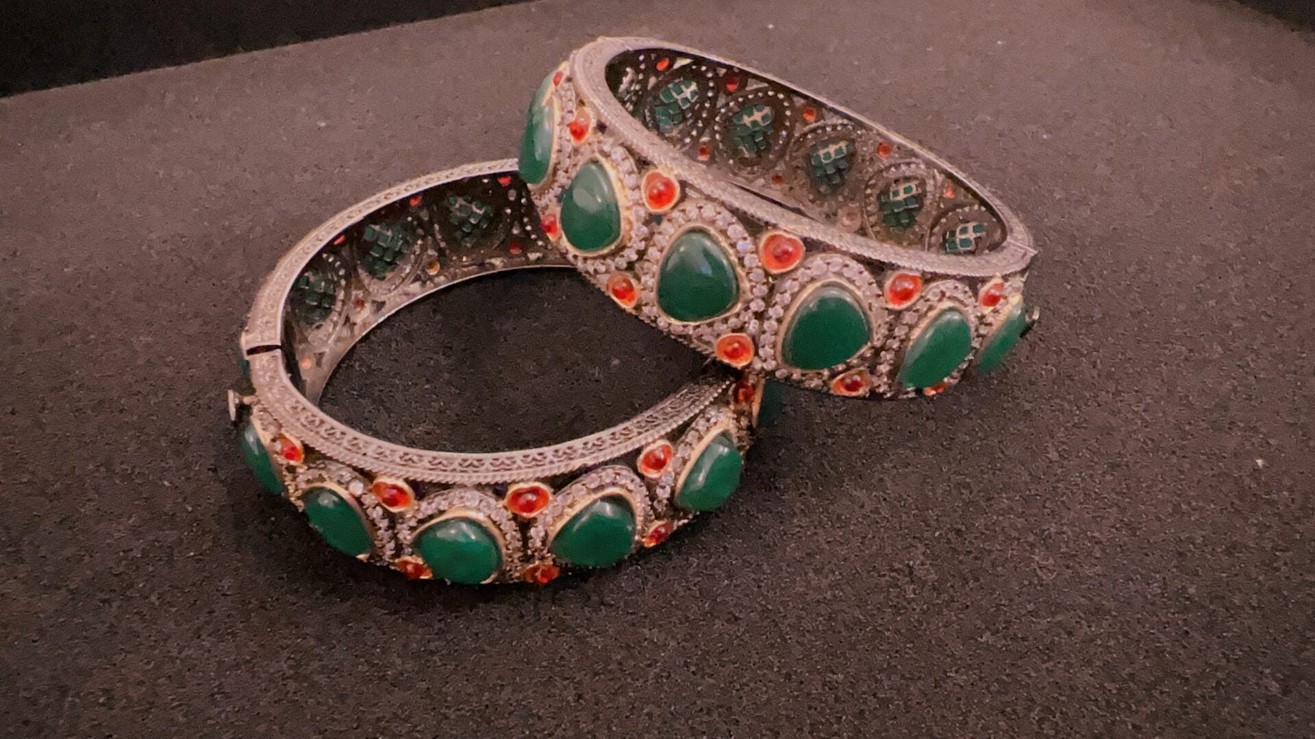 A contemporary & ethnic weaving of love crafted with emerald gemstones, zirconia & red crystal bangles for your special occasions.