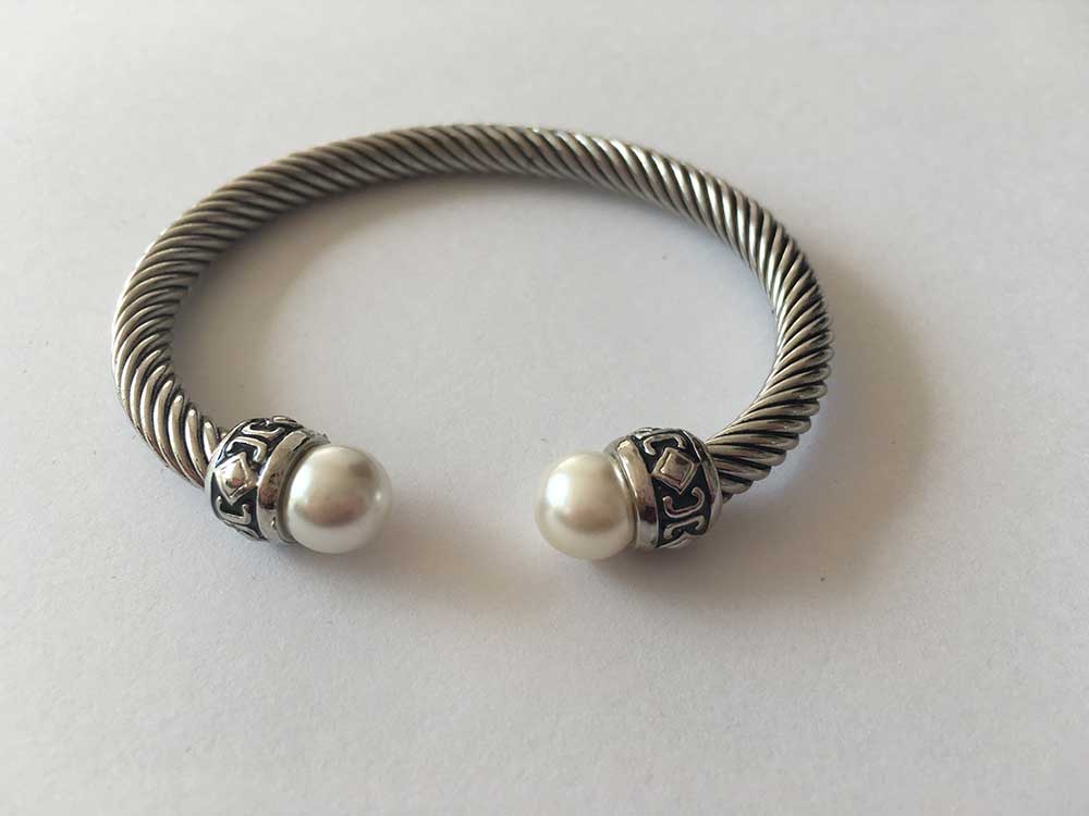 A silver open-ended bracelet with a twisted rope design, adorned with elegant white pearls framed by intricate geometric metalwork at each end.