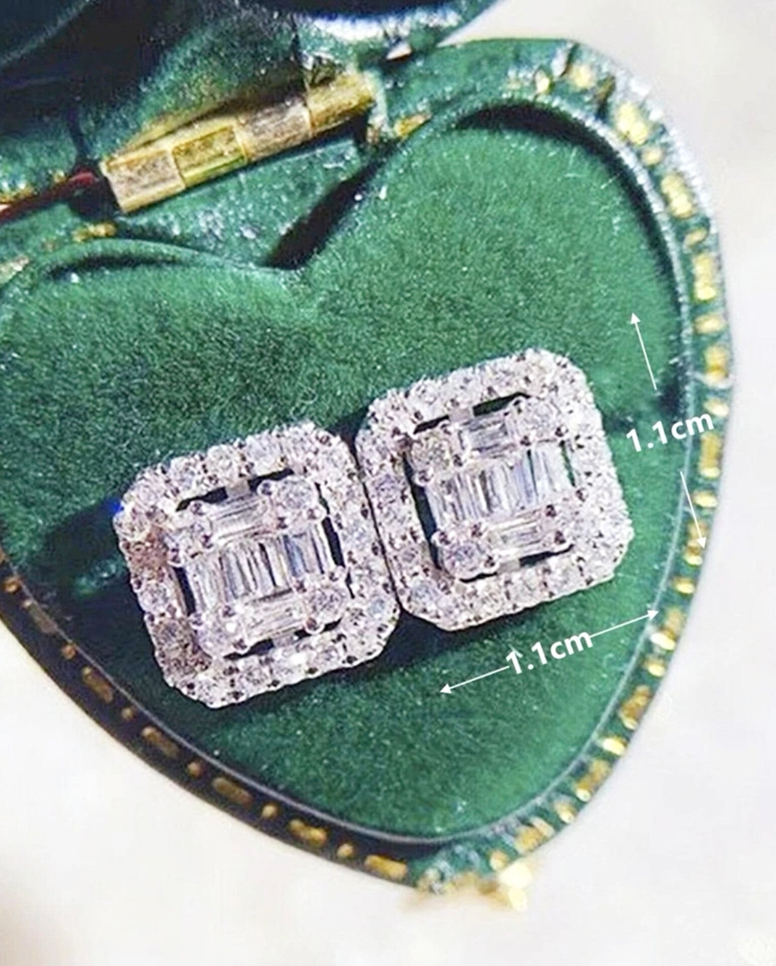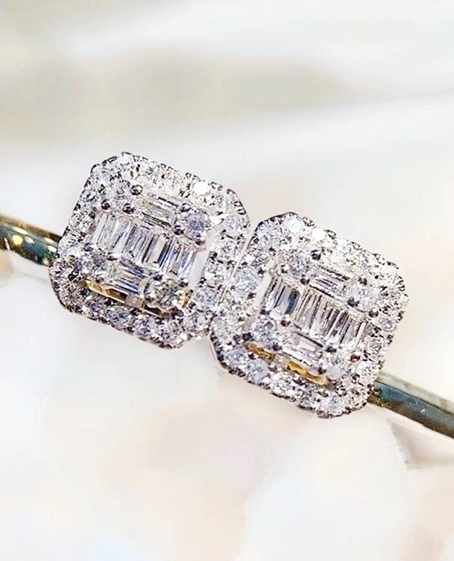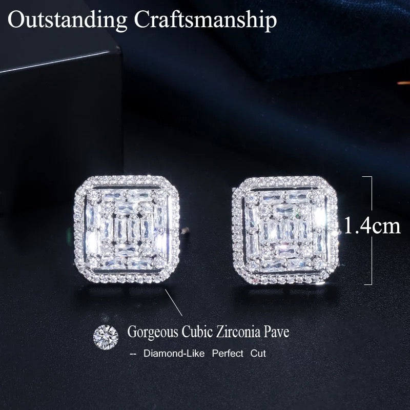 Two pairs of square-shaped earrings, one in silver and the other in gold, featuring intricate geometric patterns and sparkling diamond-like details-luxurious and timeless.