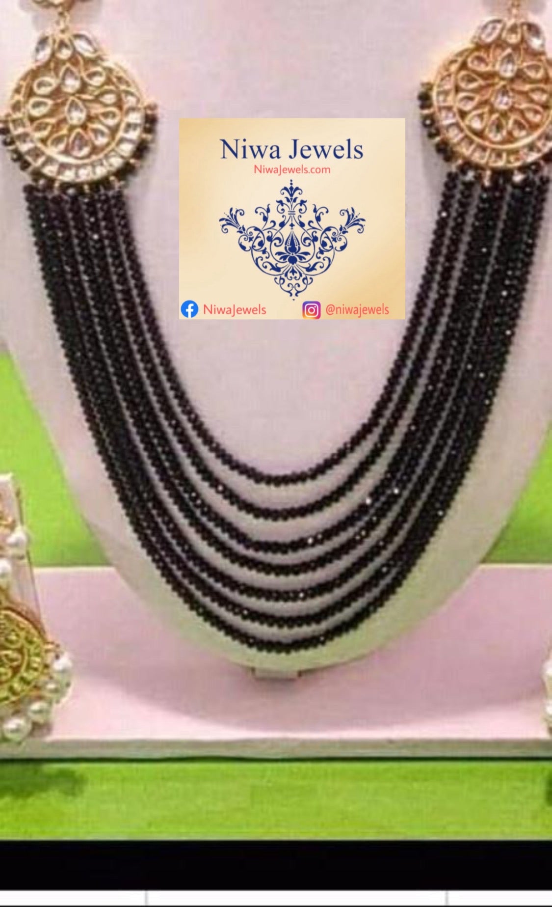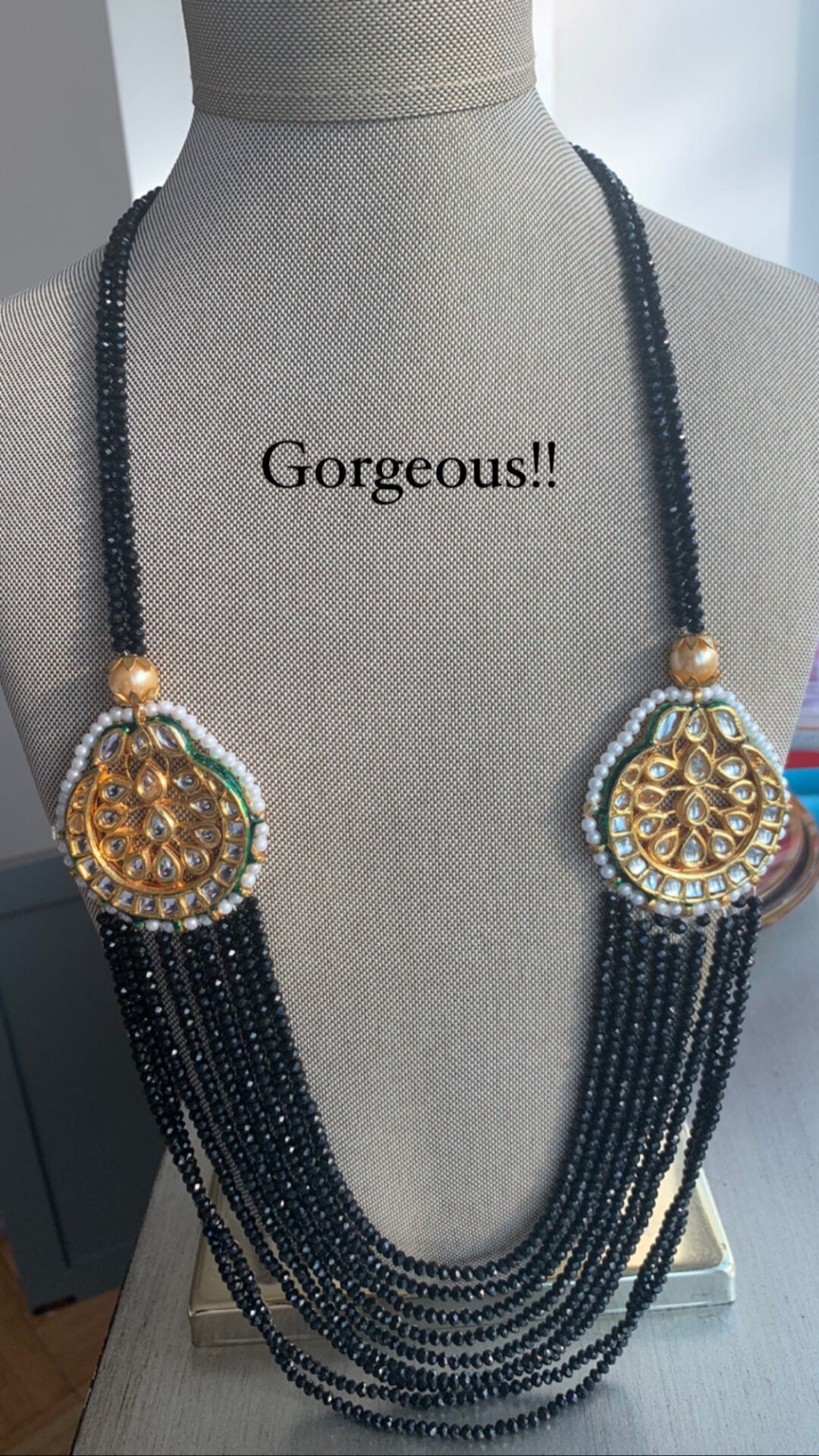 A layered black bead necklace with intricate golden pearl ornaments, radiating timeless elegance and refined charm.