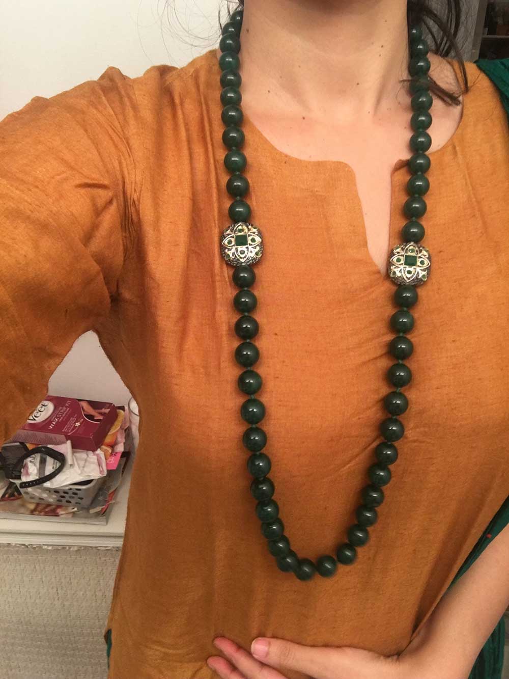 A sleek long necklace featuring dark green beads with ornate gold-accented elements, exuding timeless elegance and intricate craftsmanship.