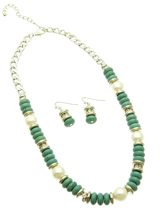 This elegant set features a necklace of turquoise beads, white pearls, and silver spacers, paired with matching earrings for a timeless and versatile look.
