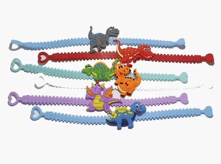 Vibrant dinosaur-themed wristbands with flexible bands and colorful heart clasps, blending playfulness with charm-ideal for kids' accessories or party favors.