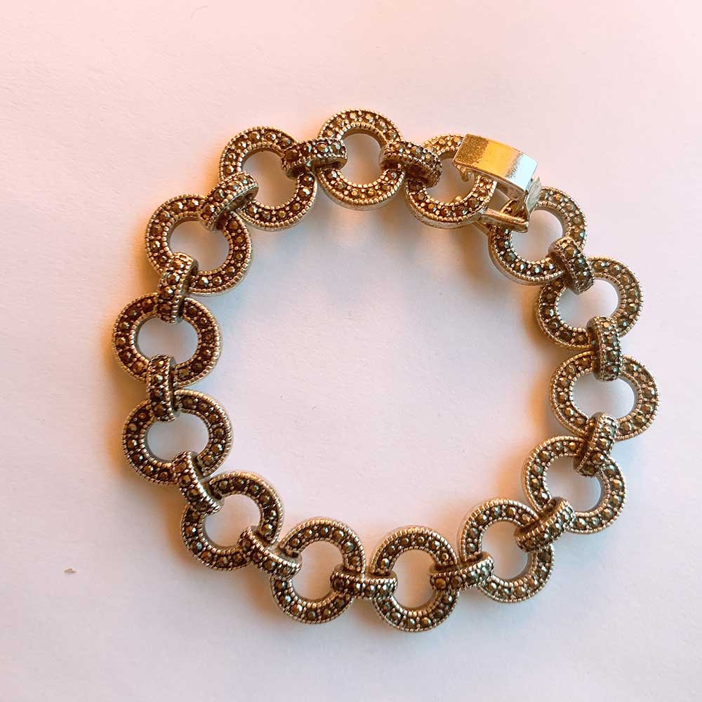 A gold bracelet of interlocking circular links, adorned with intricate detailing-ornate and timelessly sophisticated.