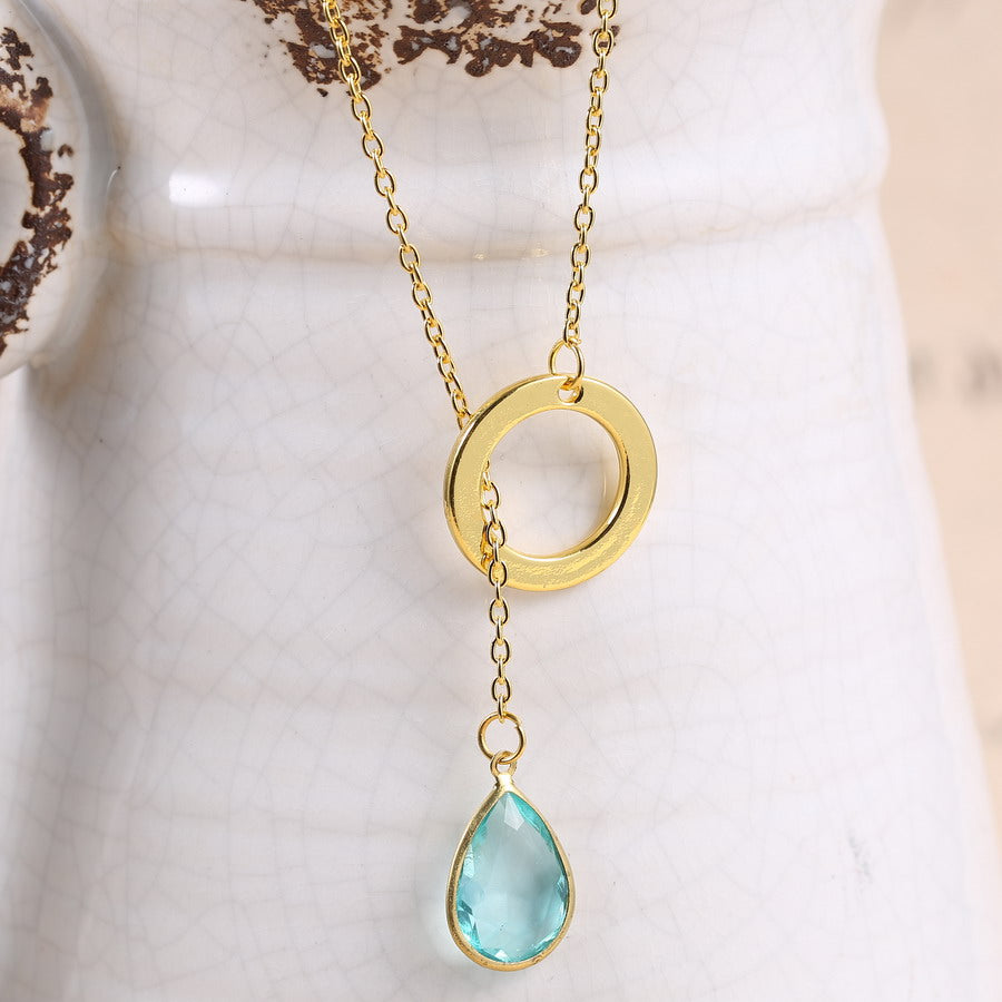 This gold necklace showcases a delicate chain and a circular pendant with a teardrop-shaped blue gemstone. The sparkling gemstone and intricate design exude understated elegance and charm.