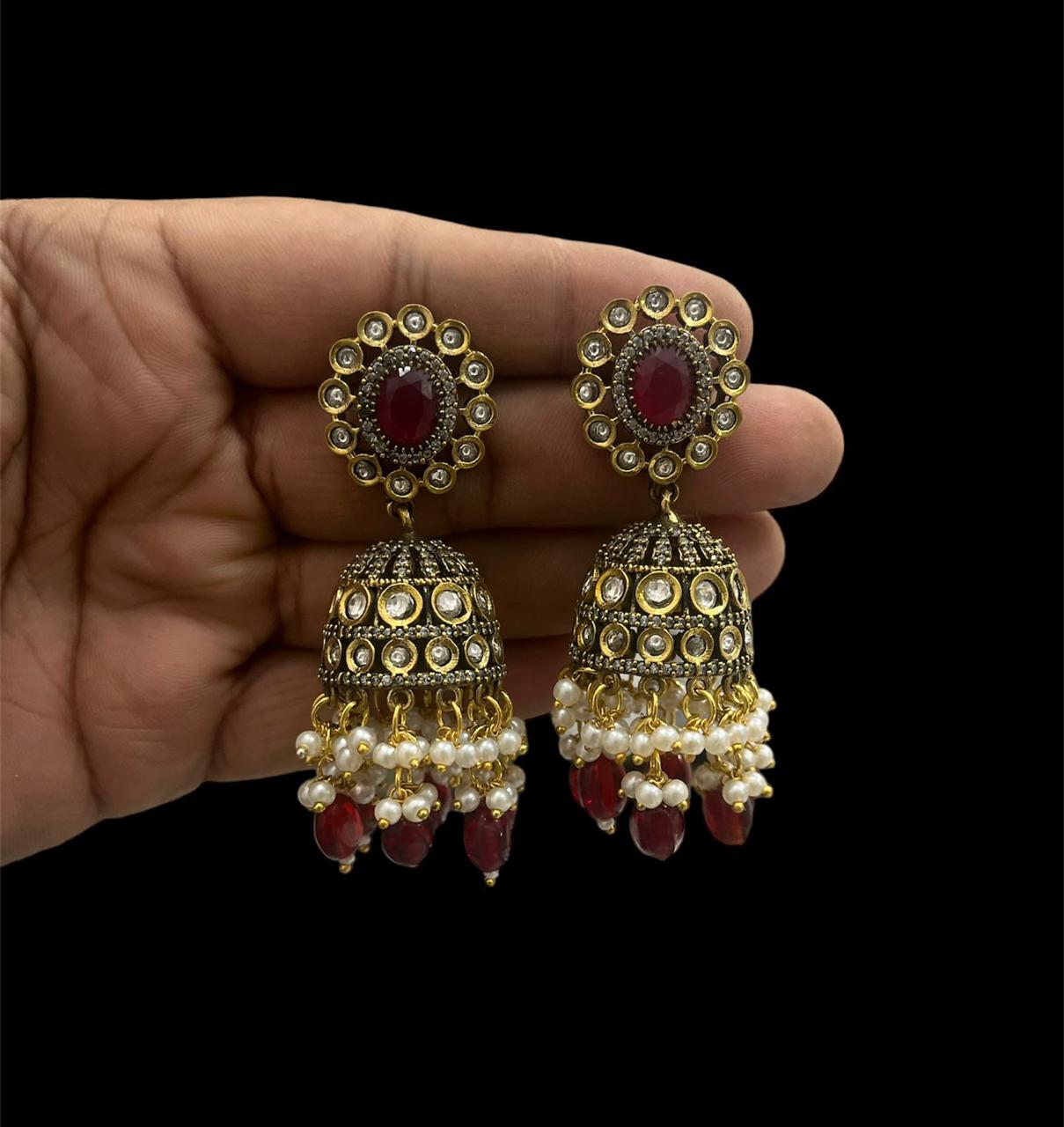 These exquisite jhumka earrings feature a regal combination of deep ruby-red stones, sparkling white kundan accents, and delicate pearl and bead hangings. A perfect choice for bridal or festive occasions, blending traditional charm with intricate craftsmanship.
