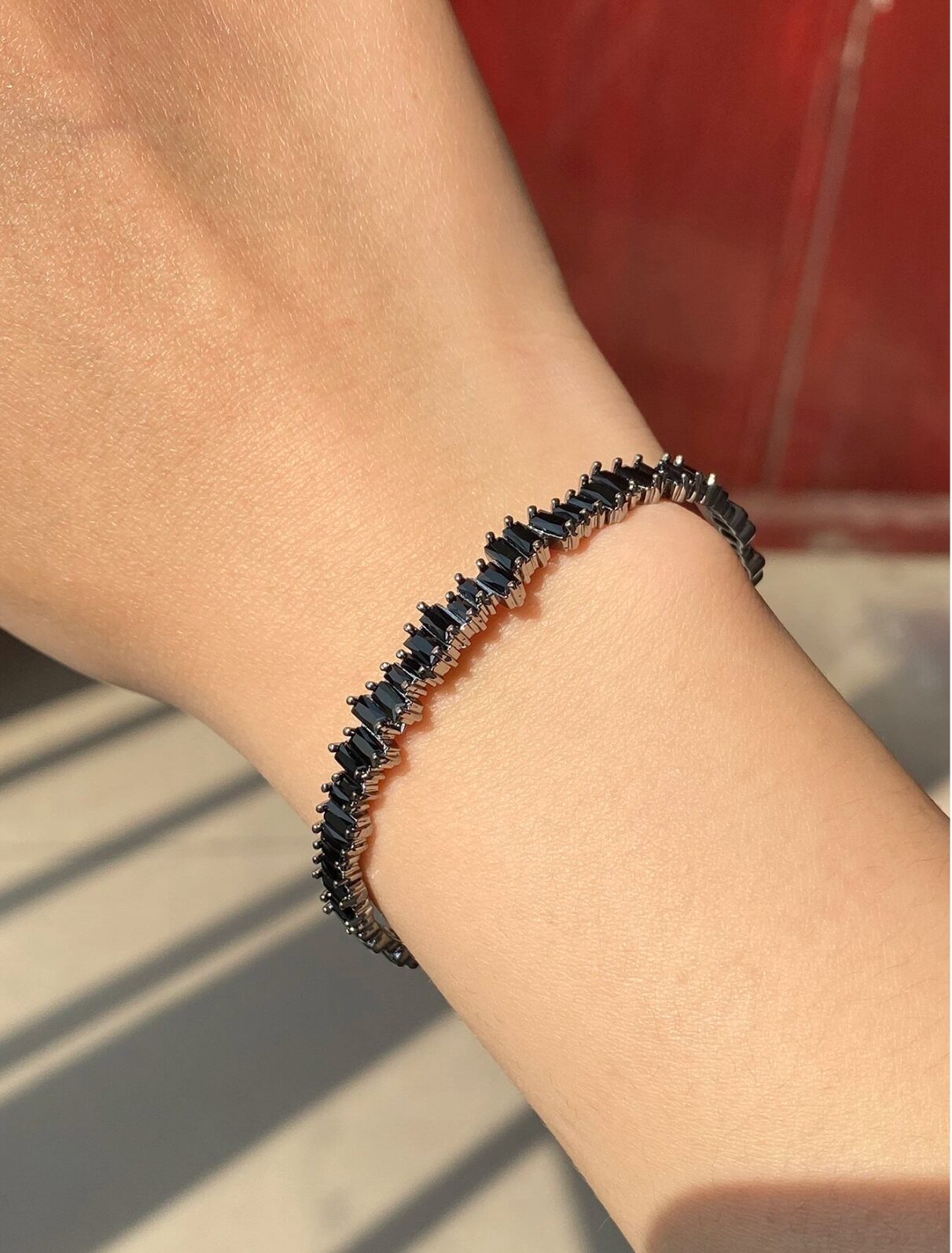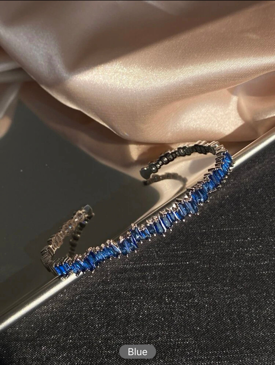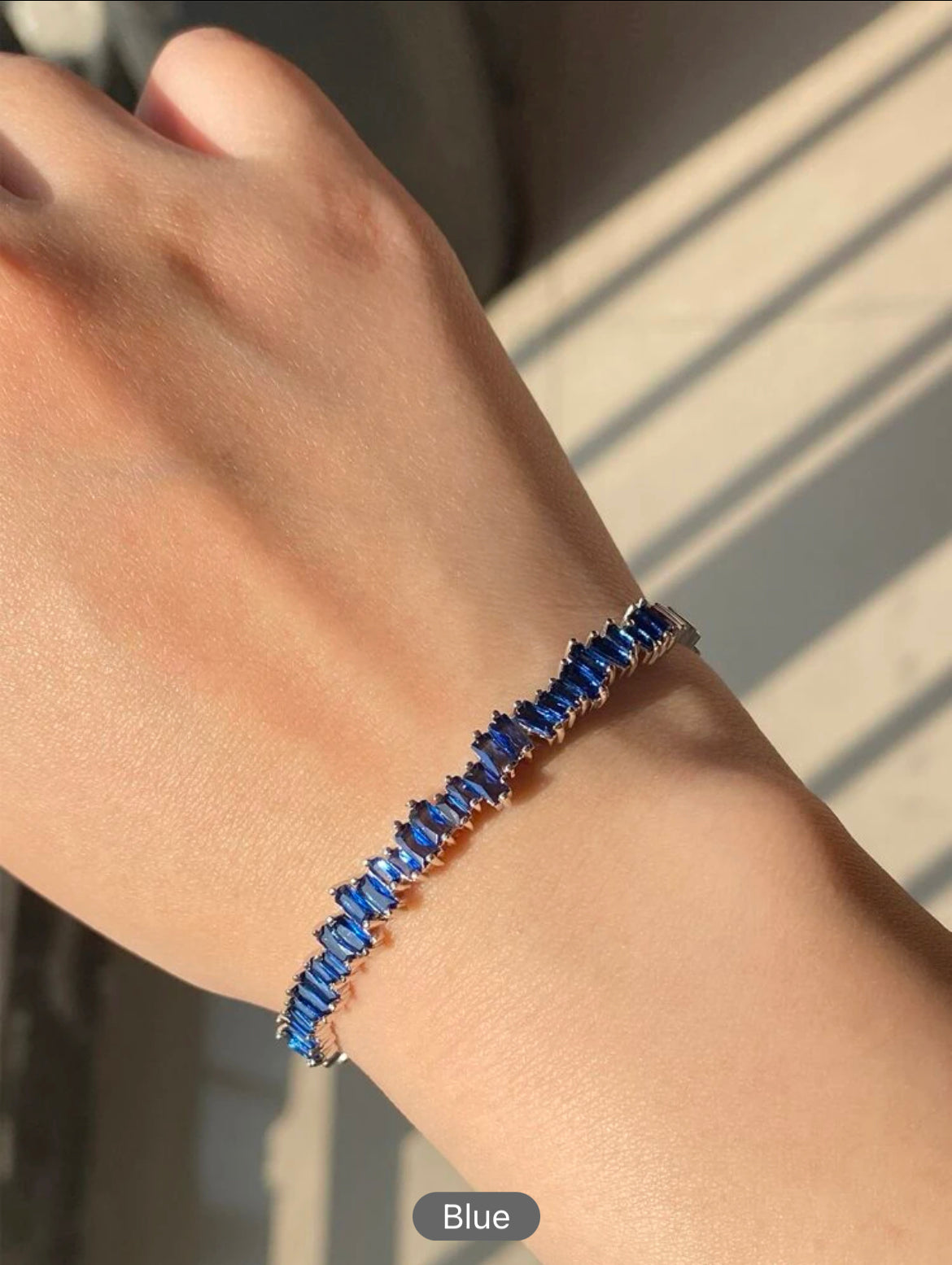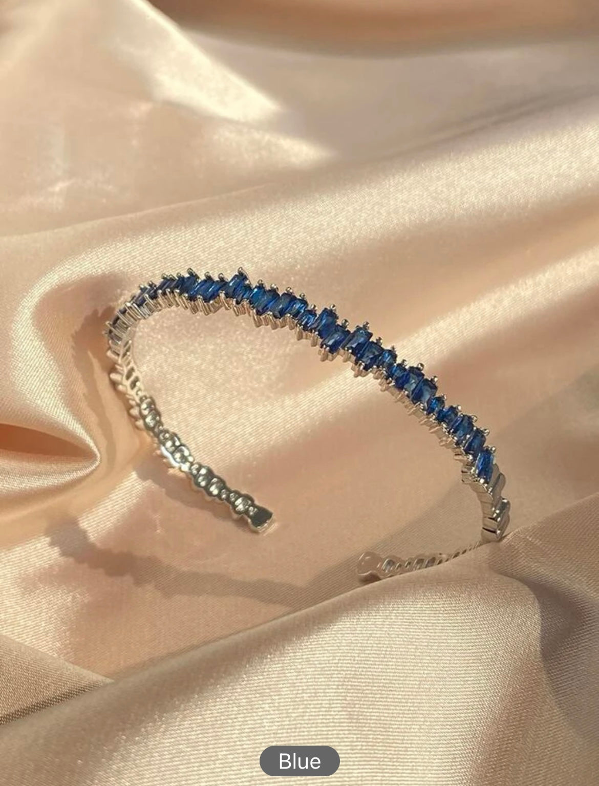 A stunning bracelet showcasing rectangular blue gemstones in a continuous silver band-elegant and timeless sparkle.