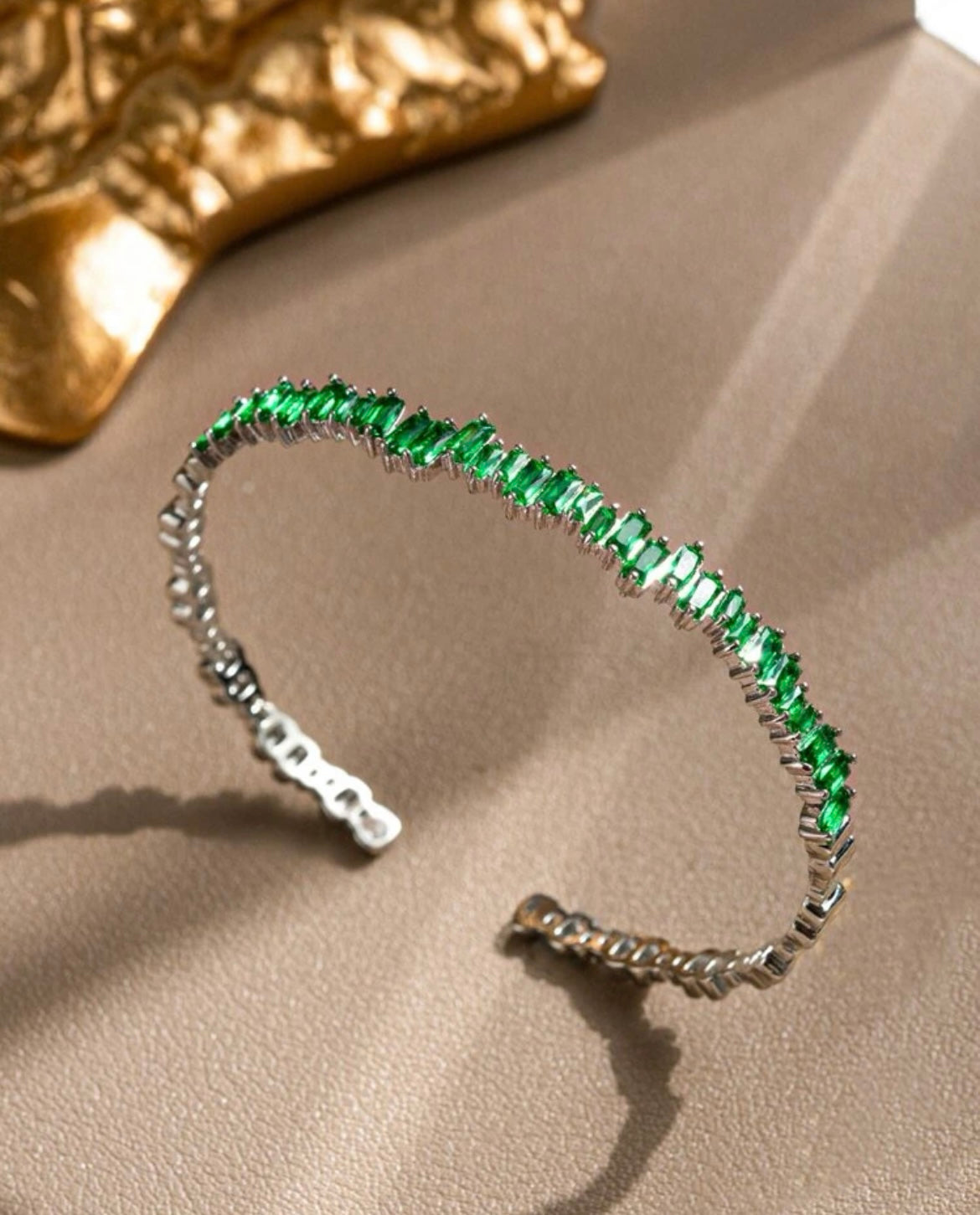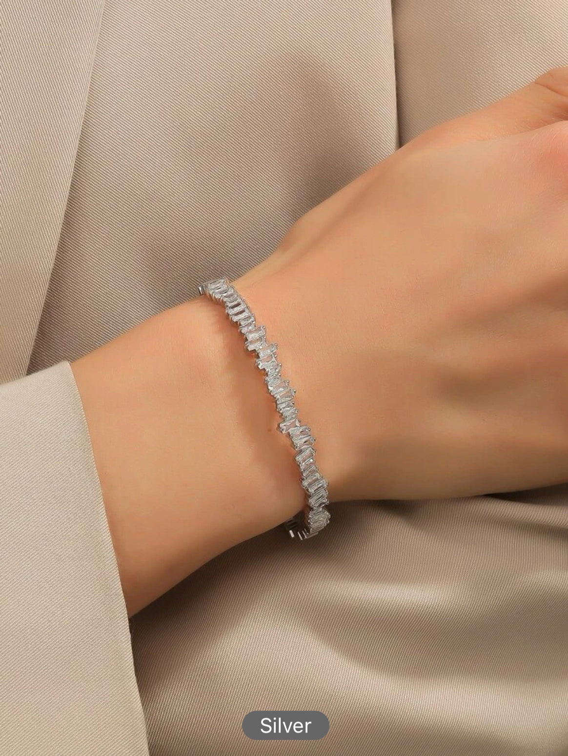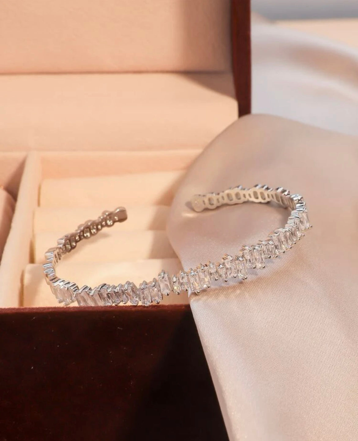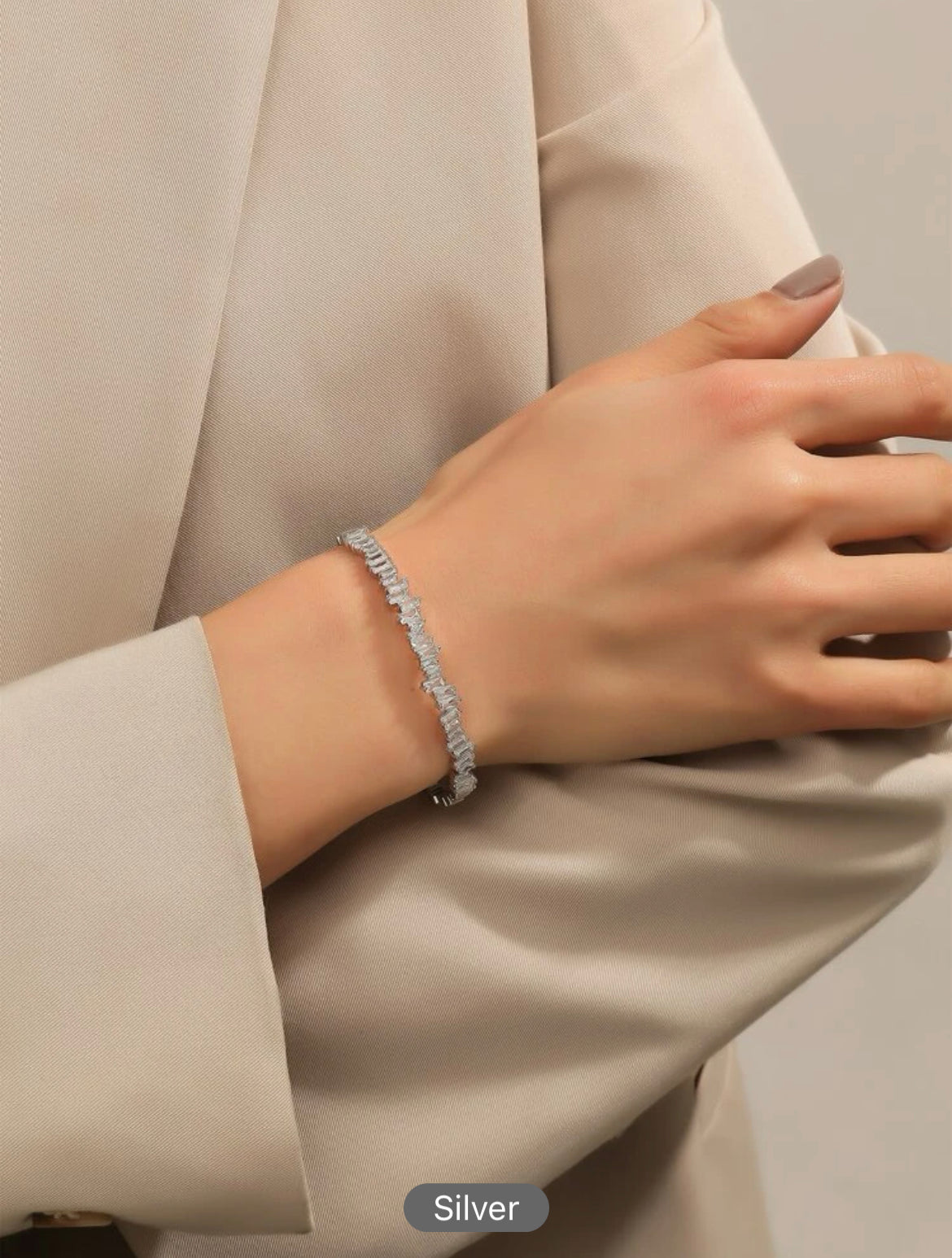 A stunning bracelet showcasing rectangular blue gemstones in a continuous silver band-elegant and timeless sparkle.