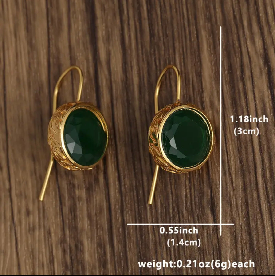 The earrings are gold-plated with round, green stones, secured with fish hook ear wires.
