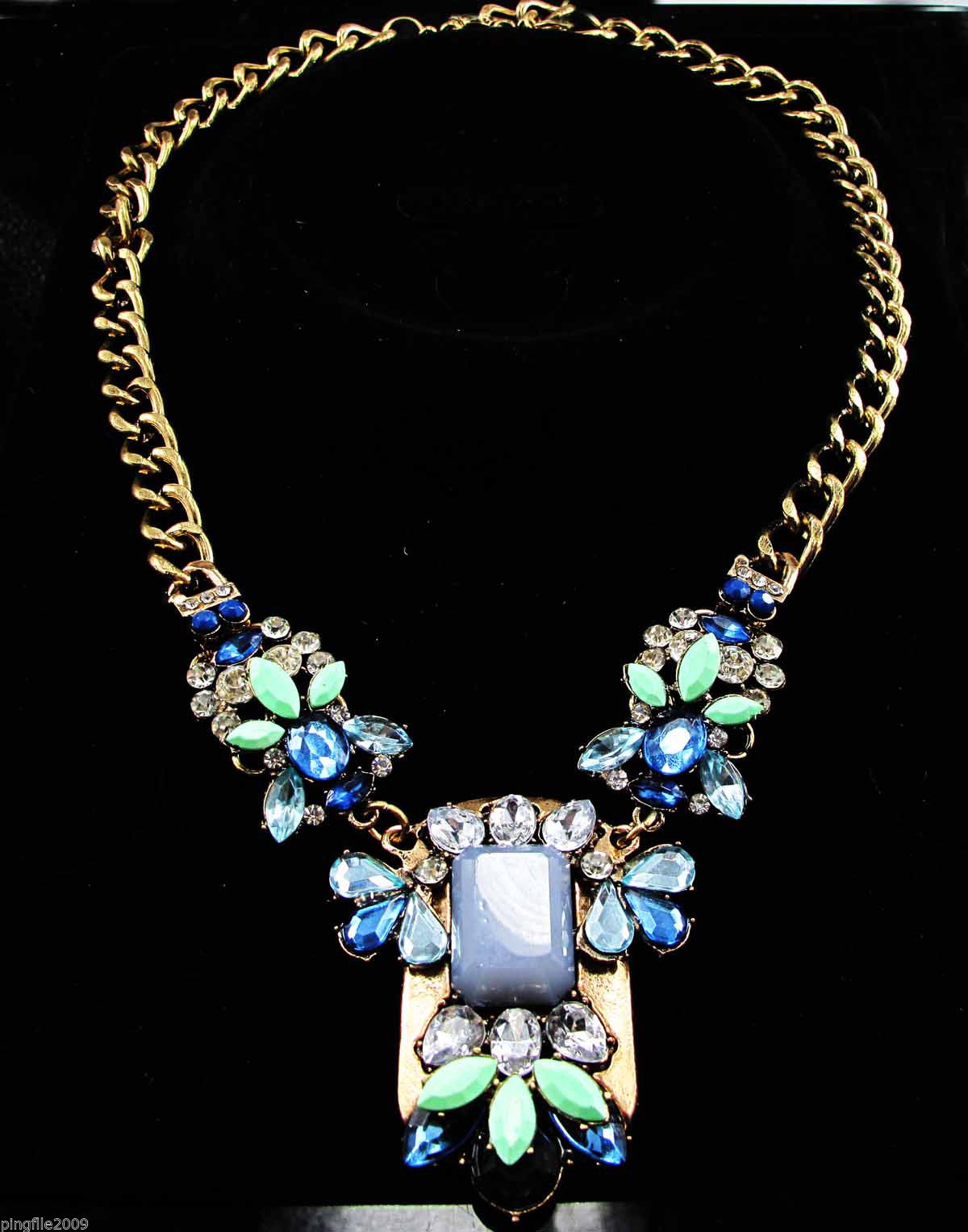A gold necklace with a vibrant pendant featuring a rectangular stone framed by colorful gemstones in a floral design.