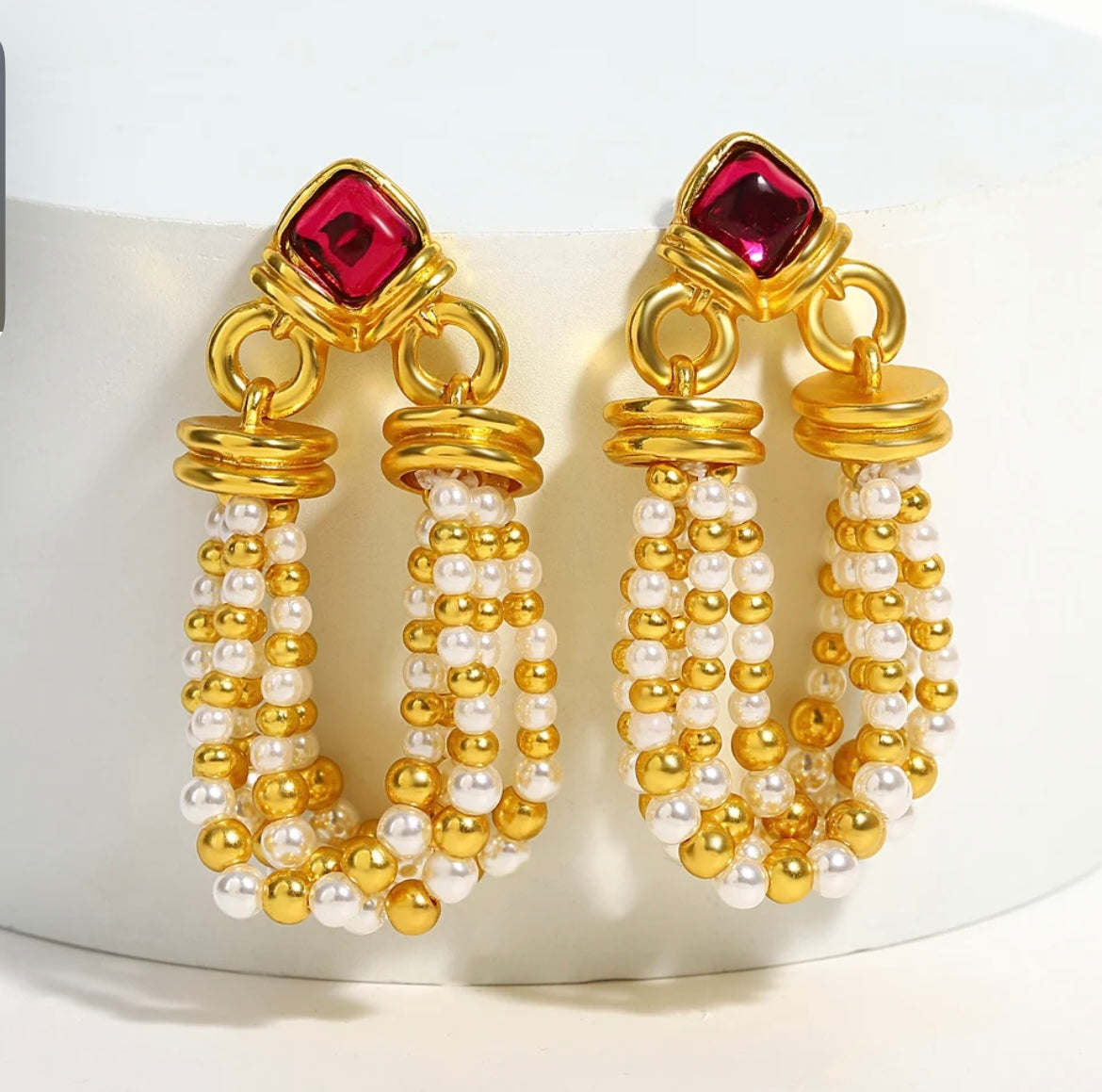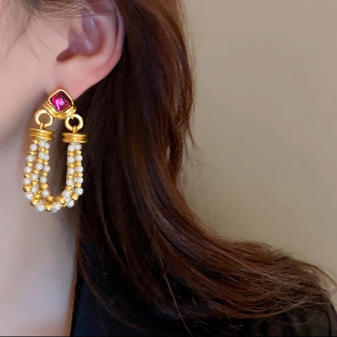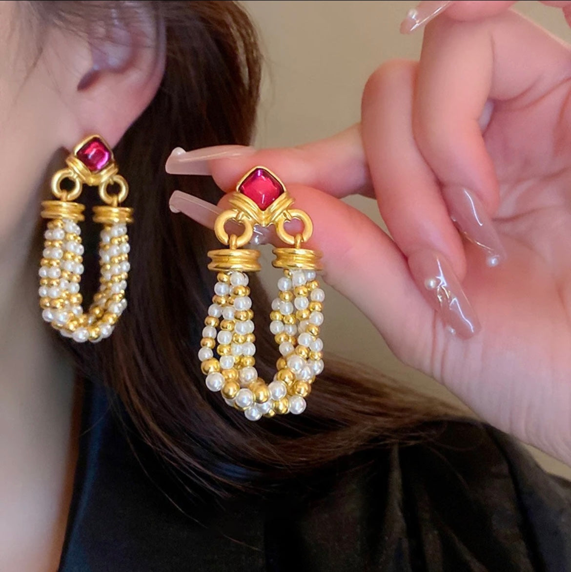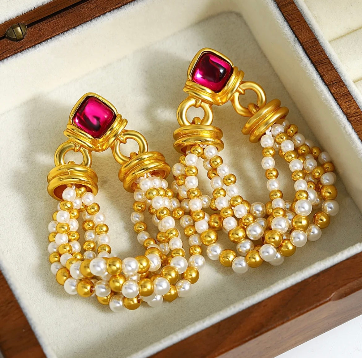 Medieval style gold tassel drop earrings, featuring pearls with a red simulated garnet.