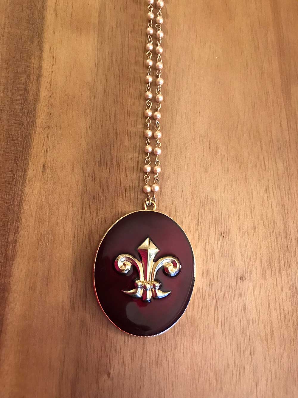 A pearl necklace with an oval pendant featuring a golden fleur-de-lis on a deep red background-simple yet timelessly elegant.