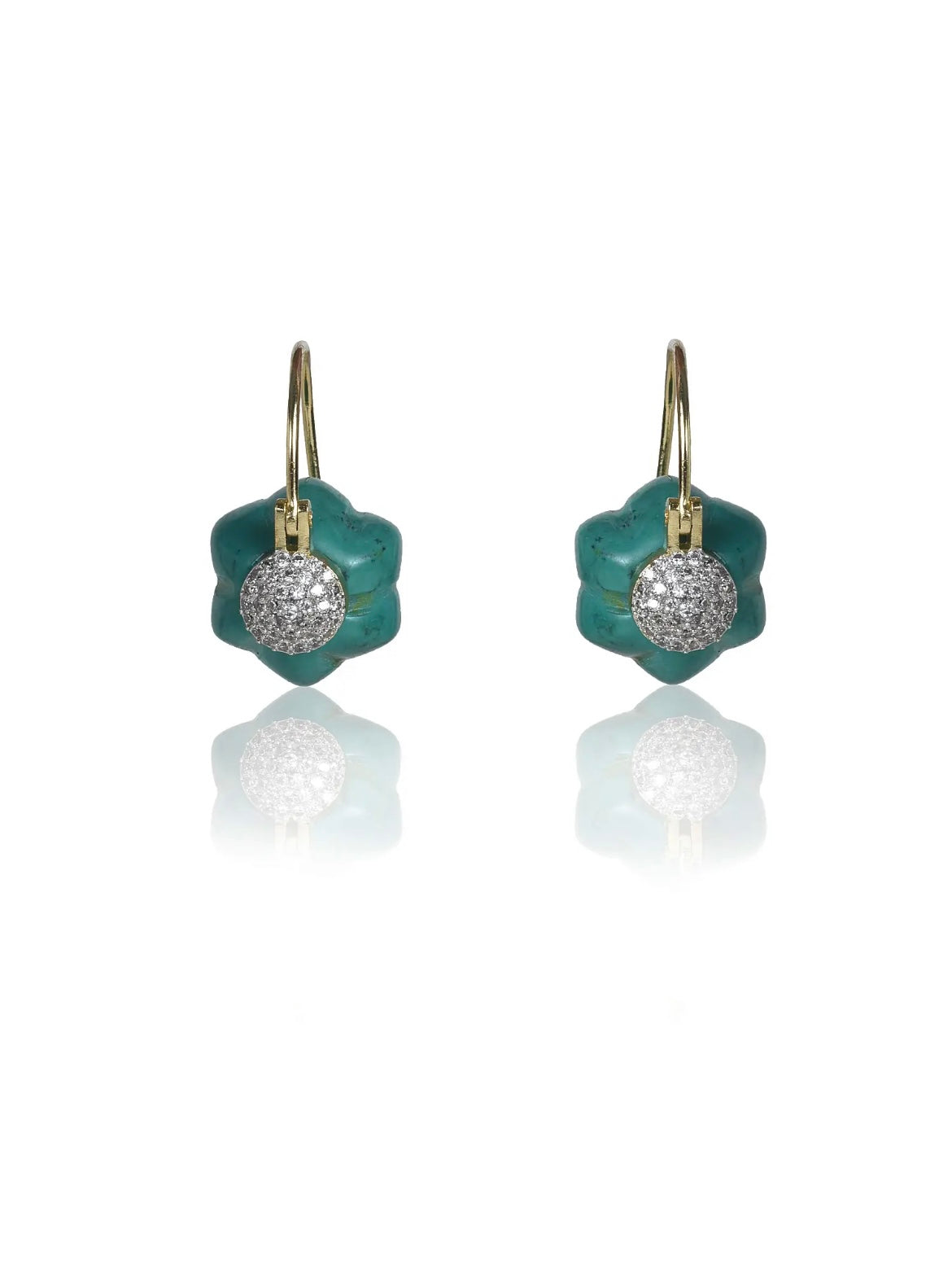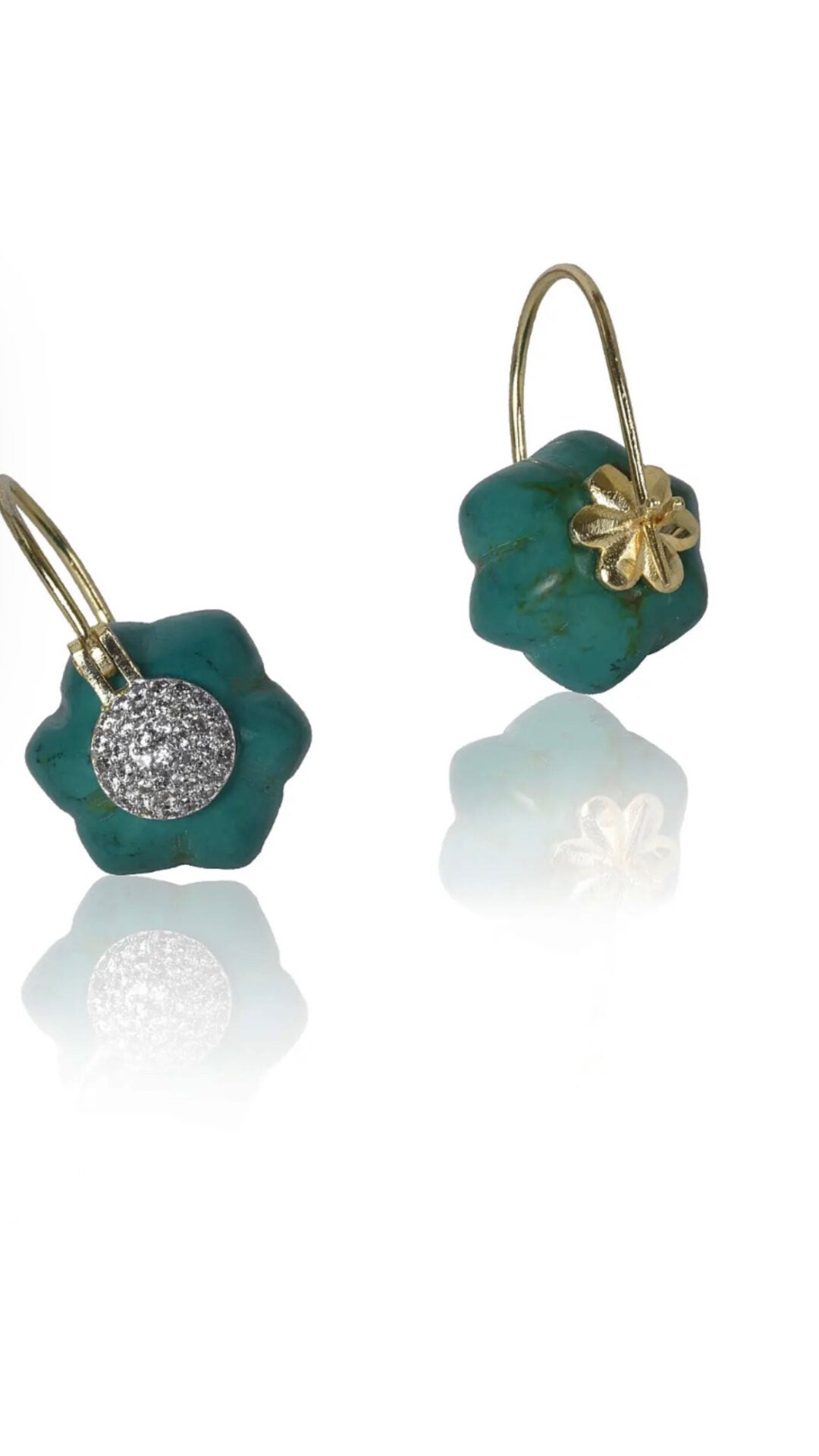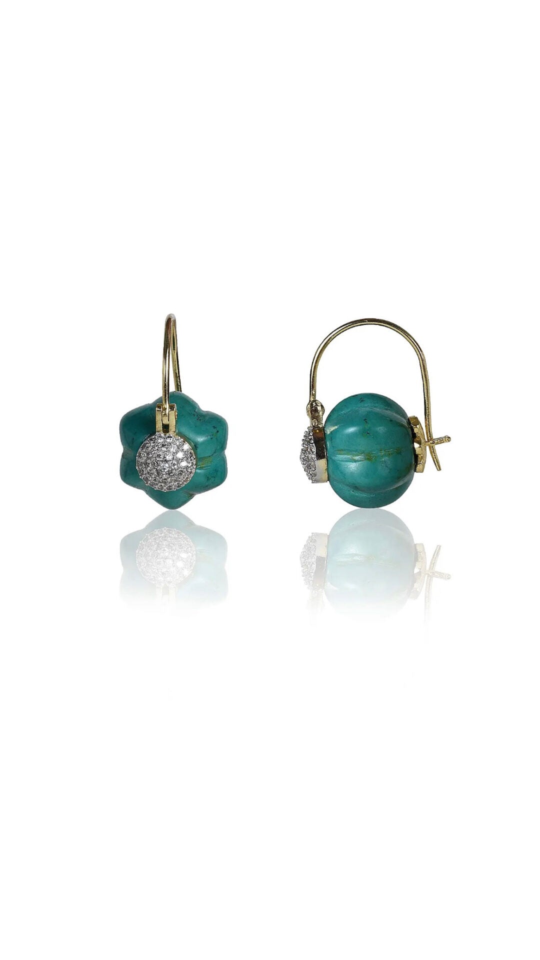 These earrings feature sculpted turquoise pumpkin shaped charms adorned with a sparkling pavé-set cz. Suspended from sleek gold hooks, they add a touch of modern elegance to any look.