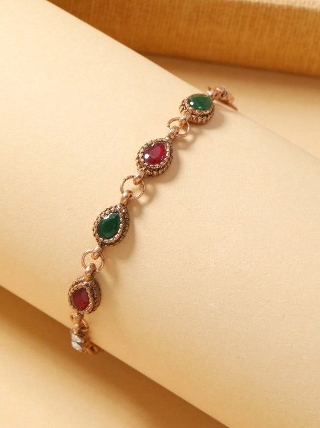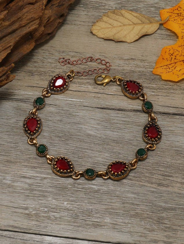 The bracelet features a antiqued gold-toned metal base adorned with alternating gemstones and adjustable chain.